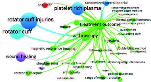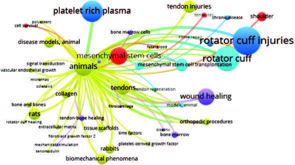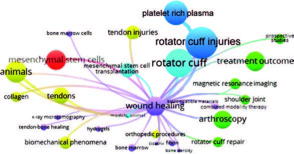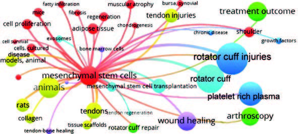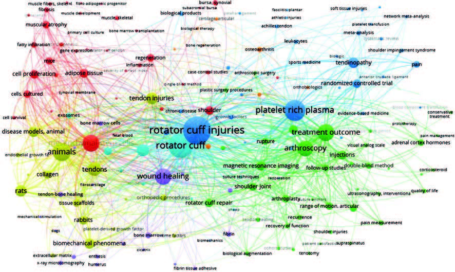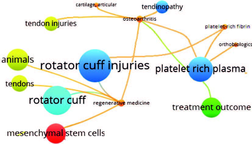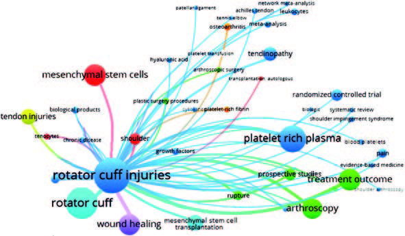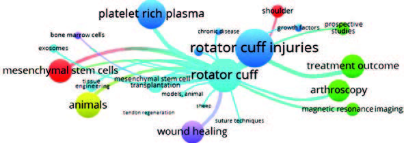 Methods. This study investigated publications dated 2013 to 2022 and published in the PubMed international reference and bibliographic database, using terminology-based search queries, i.e. (concentrated bone marrow aspirate OR stem cells OR platelet) and (rotator cuff injury). The search yielded 484 relevant scientific papers. Relevant bibliographic information was uploaded in “.txt” format into the VOSviewer 1.6.20 analytical software.