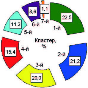 При 3 повторениях в массиве статей оказалось 207 ключевых слов, которые при помощи программы VOSviewer распределили в 7 кластеров (рис. 3): 1-й кластер состоял из 44 слов, 2-й – из 38, 3-й – из 31, 4-й – из 47, 5-й – из 12, 6-й – из 25, 7-й – из 8 слов. Доли общей силы кластеров ключевых слов в массиве статей представлены на рис. 4. В табл. 1 отобраны 10 ключевых слов с наибольшей силой связи в кластере.