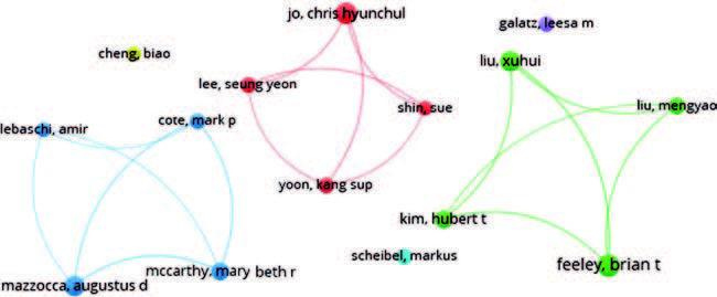 В предыдущей нашей публикации при помощи программы VOSviewer проведен анализ направлений научных исследований при травмах вращательной манжеты плеча [1]. Например, в 1-м кластере объединили статьи, в которых анализировали травмы и другие повреждения вращательной манжеты плеча и сухожилий, во 2-м – результаты артроскопической реконструкции повреждений вращательной манжеты, в 3-м – анатомию плечевого сустава, в 4-м – биомеханику плечевого сустава и манжеты ротаторов, в 5-м – послеоперационный анализ хирургической реконструкции повреждений вращательной манжеты плеча, в 6-м – хирургические подходы (техники) при реконструкции повреждений вращательной манжеты, в 7-м – структурное восстановление функции плеча после хирургической реконструкции повреждений вращательной манжеты. Найдены ведущие авторы и научные школы.