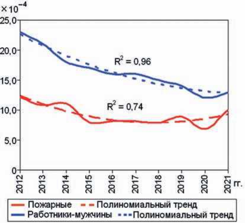 В предыдущих наших публикациях представлен производственный травматизм за 15 лет (2006–2020 гг.) в мире, России и личного состава Федеральной противопожарной службы (ФПС) Государственной противопожарной службы МЧС России [5]. В указанный период среднегодовой показатель уровня травматизма составил у работающих мужчин в мире (144,11±9,77) травм в год на 10 тыс. мужчин или 10⁻⁴, у работников-мужчин в экономике России – (22,73±2,18) · 10⁻⁴, личного состава ФПС МЧС России – (14,66±2,01) · 10⁻⁴ травм/ (пожарных · год).