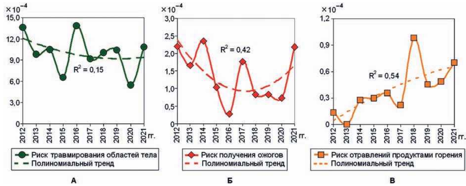Results and Discussion. Over a 10 year’s timespan, 1,769 occupational injuries have been registered among Federal Fire Service officers EMERCOM of Russia. The occupational injury rate for firefighters was (9.19±0.54) · 10⁻⁴ injuries/(person · year), which was statistically significantly lower (p < 0.001) than for male workforce employed in Russian economy sectors – (16.50±1.09) · 10⁻⁴. The overall average diagnose per injury rate was 1.5, including 1.7 in firefighting and other emergency response activities, 1.4 in combat training activities, and 1.5 in routine activities. The weighted average risk of body injuries was (11.96±0.89) · 10⁻⁴ injuries/(person · year); in particular, cumulative injury risk rate was (10.01±0.83) · 10⁻⁴ responsible for 83.6 % of the total value, with burns (1.39±0.23) · 10⁻⁴ (equal to 11.6 %), poisoning by combustion products (0.39±0.09) · 10⁻⁴ (equal to 3.3 %), heat fainting (0.18±0.04) · 10⁻⁴ (equal to 1.5 %) respectively. The congruent risk trends for occupational injuries, industrial head and body injuries, including burns, are positive and statistically significant, which suggests the trends are driven by identical (unidirectional) parameters. For determination coefficients of different significance, the polynomial trend of body injuries risk shows a downward trend of data reduction; the risk of burns resembles an inverted U-curve; while the risk of poisoning by combustion products demonstrates an increase in indicator values. Risks of injuries to the head (S00–S09 in ICD-10) showed rank 1 of significance among occupational body lesions in the entire cohort of firefighters, reaching the level of (2,49±0,32) · 10⁻⁴ injuries/(person · year) equal to 20.8 % of all occupational injuries; knee and shin injuries were assigned rank 2 (S80-S89) – (1.87±0.24) · 10⁻⁴ equal to 15.6 %; ankle and foot area were assigned rank 3 (S90–S99) – (1.11±0.15) · 10⁻⁴ equal to 9,3 %; rank 4 injuries were injuries of the thorax (S20–S29) – (0.91±0.13) · 10⁻⁴ equal to 7.6 %; wrist and hand injuries were assigned rank 5 (S40–S49) – (0.88±0.07) · 10⁻⁴ equal to 7.4 % respectively. Overall, these body traumas amounted to