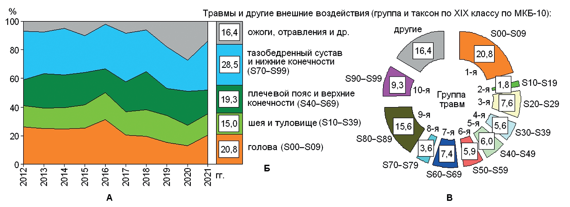 20. Рис. 19. Динамика структуры и структура поражений частей тела у личного состава ФПС МЧС России при пожаротушении (А), учебно-спортивной (Б) и повседневной деятельности (В).