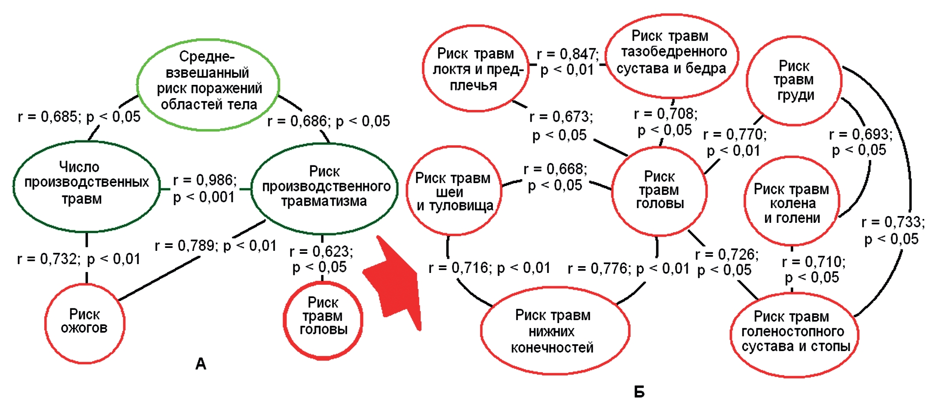 5. Рис. 4. Конгруэнтность трендов развития рисков нозологий и производственного травматизма (А), рисков травм головы и других областей тела (Б).