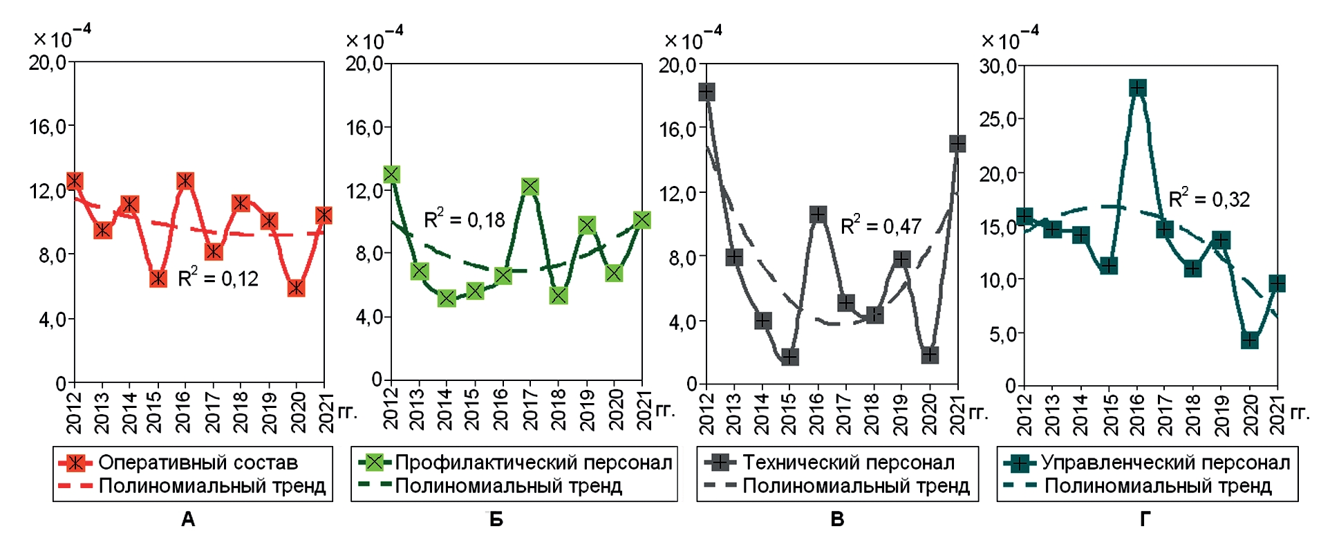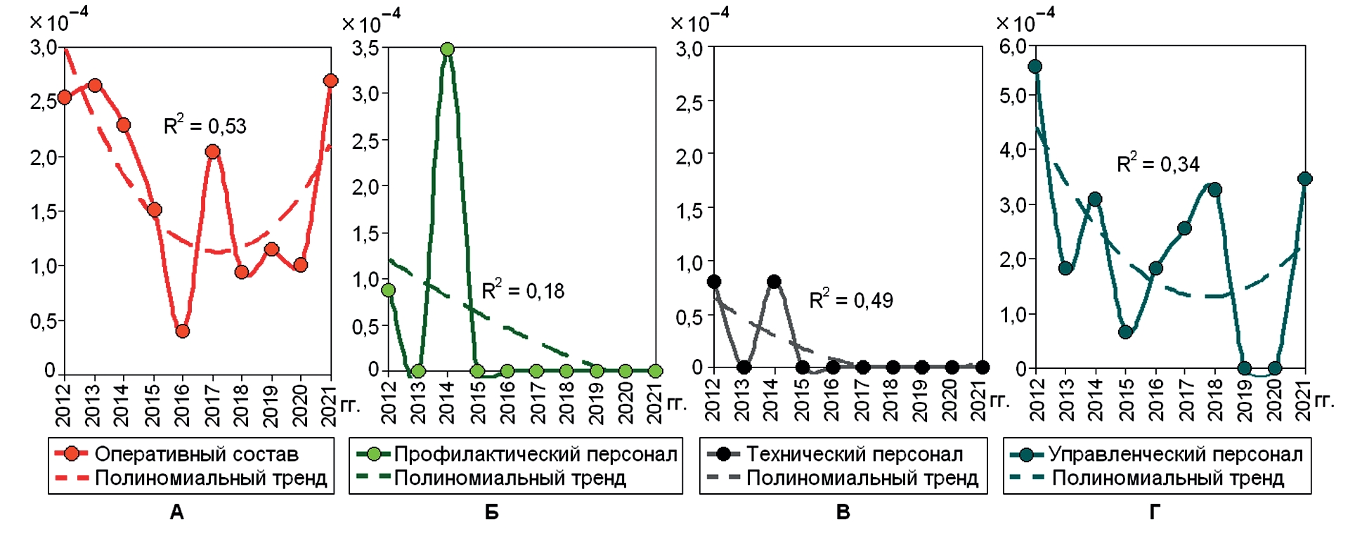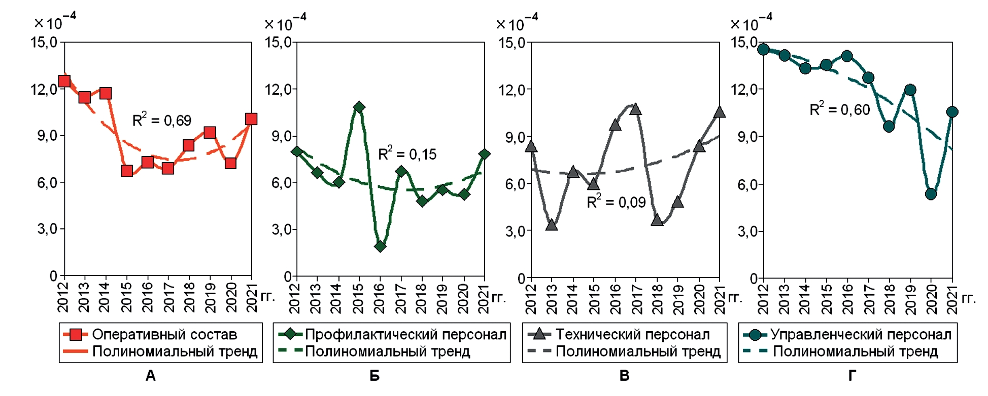 Развитие травм оценивали при помощи динамических рядов, для чего использовали полиномиальный тренд второго порядка. Коэффициент детерминации (R²) показывал связь построенного тренда с реальной тенденцией развития показателей, чем больше был R² (максимальный 1,0), тем более объективным оказался тренд [2]. Согласованность (конгруэнтность) изучаемых трендов травматизма провели с использованием коэффициента корреляции (r) Пирсона.