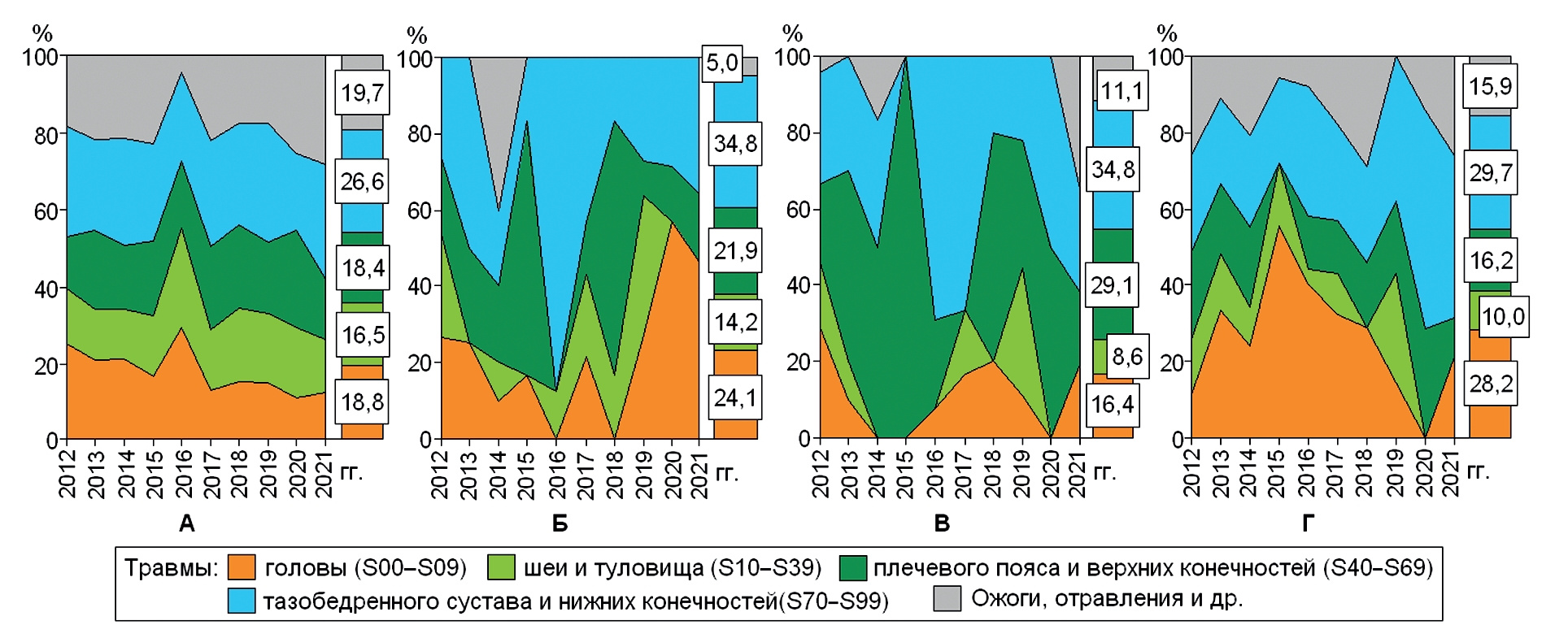 10. Рис. 9. Динамика структуры и структура поражений частей тела у оперативного состава (А), профилактического (Б), технического (В) и управленческого (Г) персонала ФПС МЧС России.