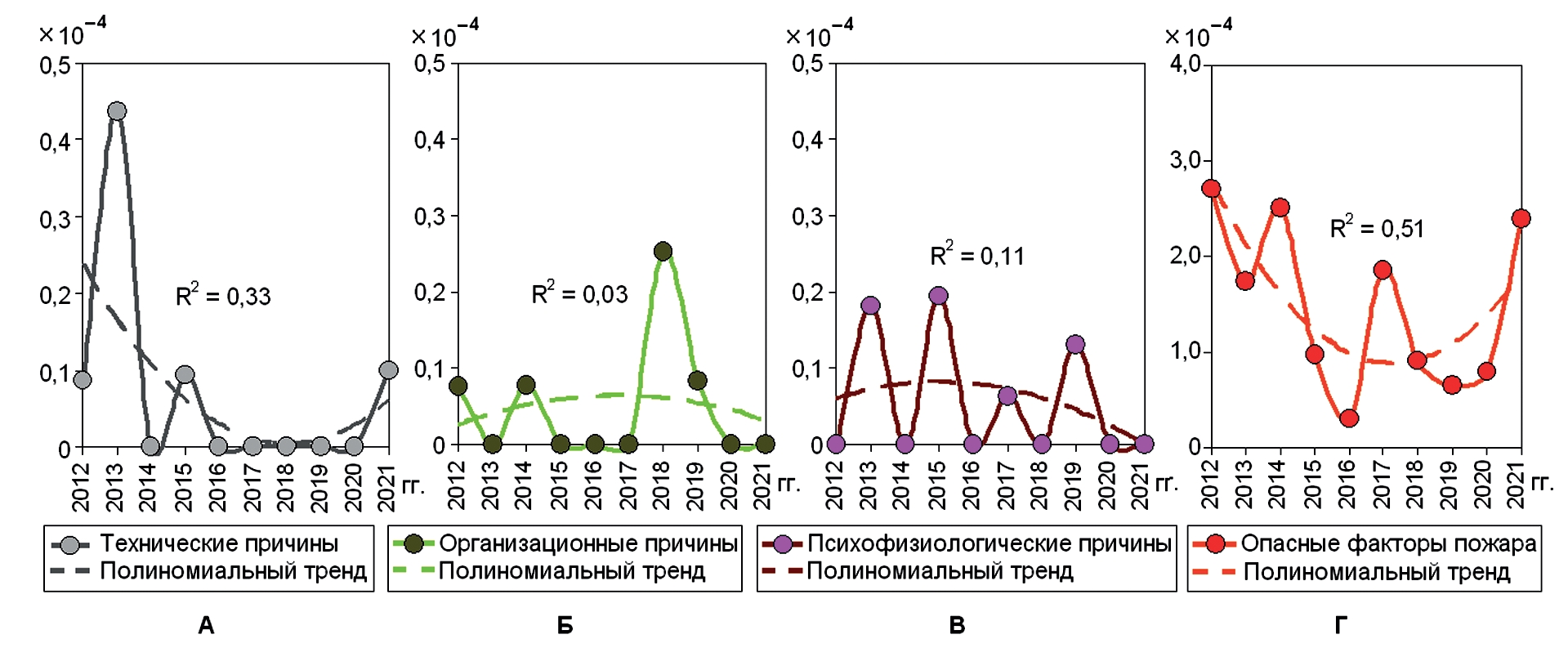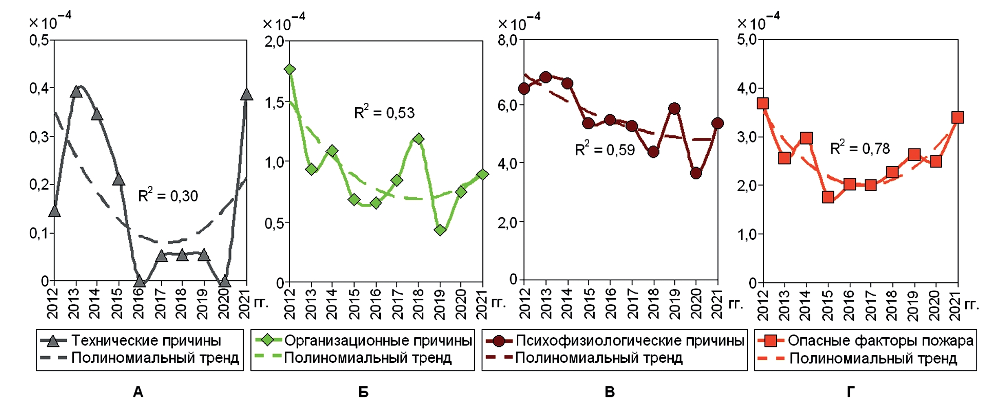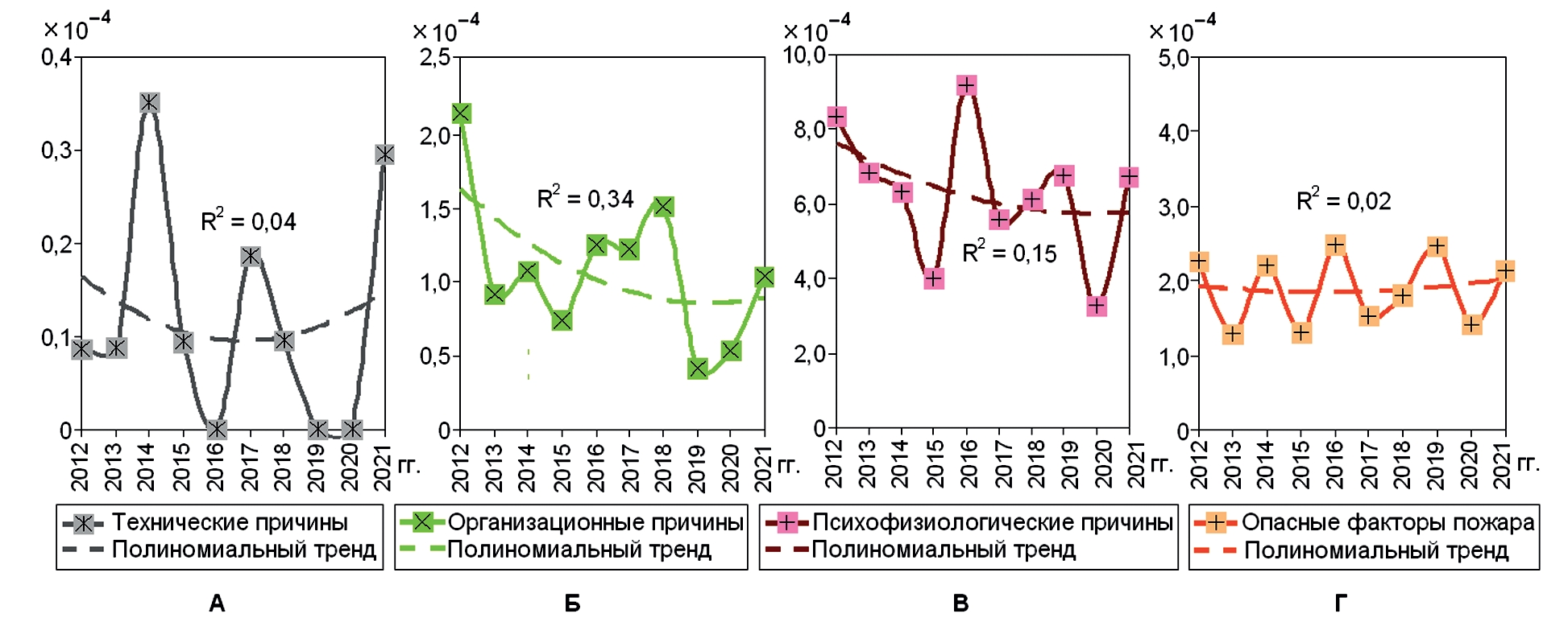 14. Рис. 13. Динамика рисков получения ожогов у личного состава ФПС МЧС России по техническим (А), организационным (Б), психофизиологическим (В) причинам травм и при опасных факторах пожаров (Г).