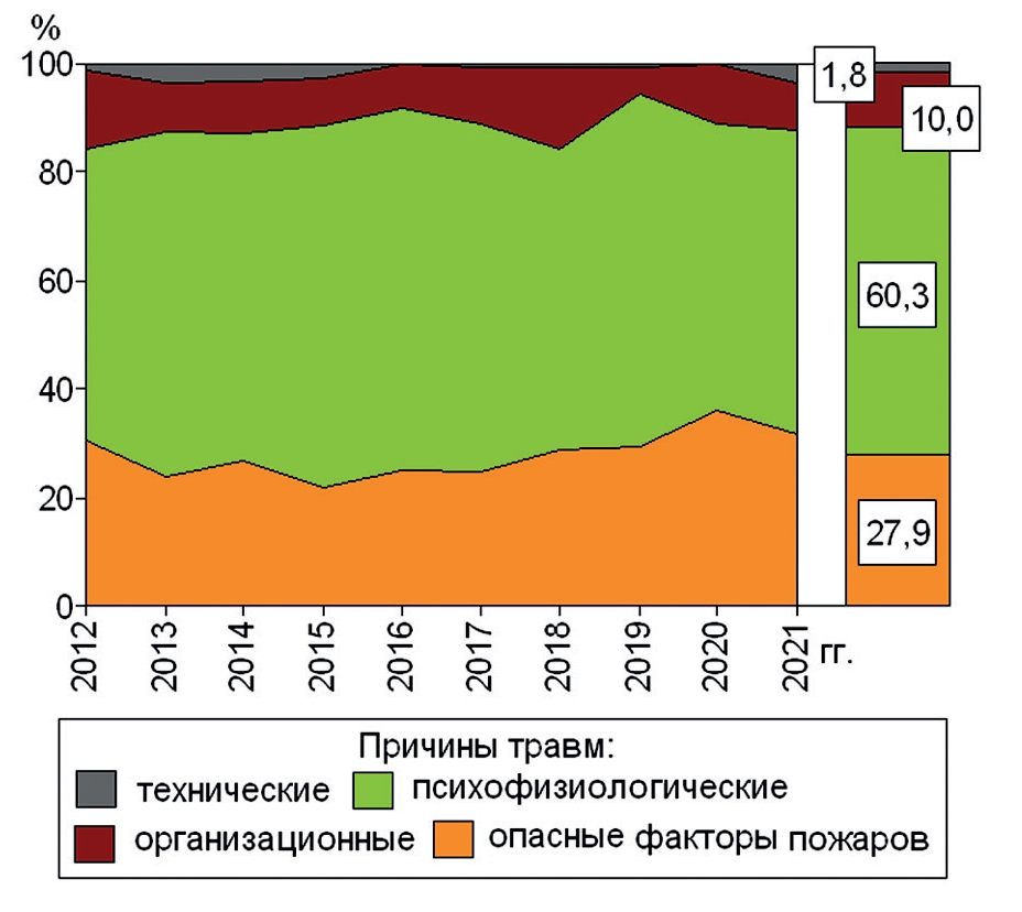 - For citing: Evdokimov V.I., Bobrinev E.V., Vetoshkin A.A., Kondashov A.A. Struktura nozologii i riski razvitiya proizvodstvennogo travmatizma lichnogo sostava Federal’noi protivopozharnoi sluzhby MChS Rossii (2012–2021 gg.). Mediko-biologicheskie i sotsial’no-psikhologicheskie problemy bezopasnosti v chrezvychaynykh situatsiyakh. 2023;