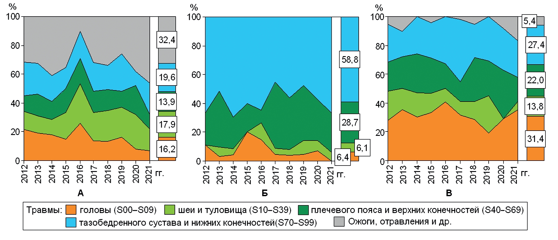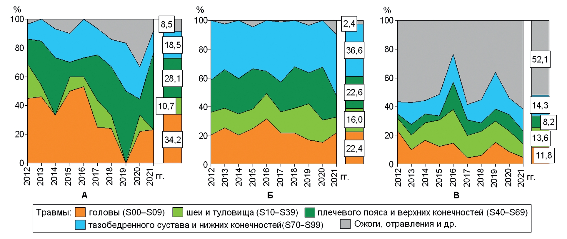Производственные травмы соотнесли с таксонами XIX класса по МКБ-10 (табл. 3). К сожалению, клинико-морфологические особенности травм в 2012–2021 гг. были представлены не во всех изученных актах о несчастных случаях на производстве, в связи с чем эти травмы классифицировались как прочие или не идентифицированные. Некоторые малочисленные нозологии, например, T79.5 «Синдром длительного сдавления», W87 «Несчастный случай, связанный с источником электрического тока неуточненным» и другие в отдельные, анализируемые рубрики не выделяли.