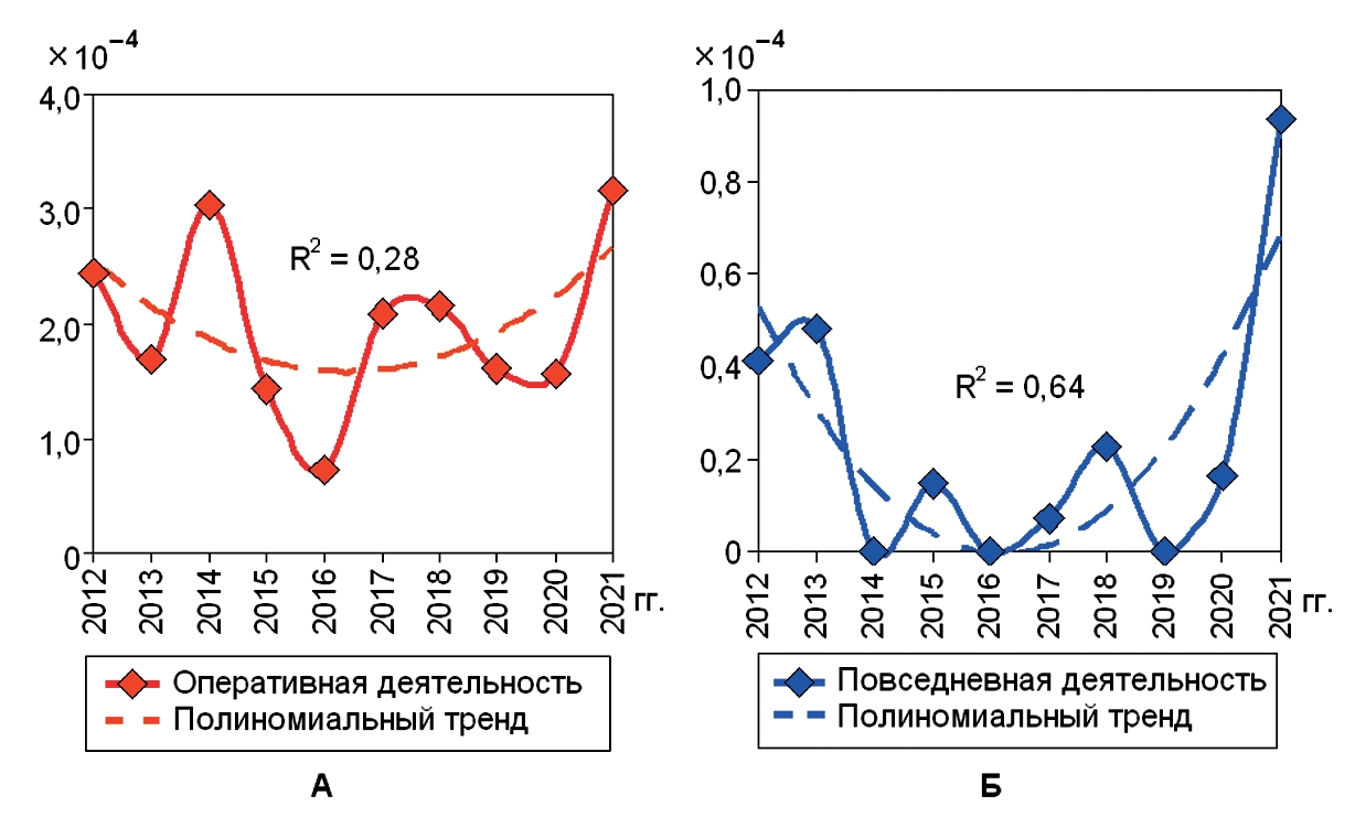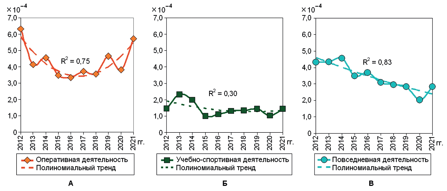 6. Рис. 5. Динамика рисков производственного травматизма оперативного состава (А), профилактического (Б), технического (В) и управленческого персонала ФПС МЧС России.