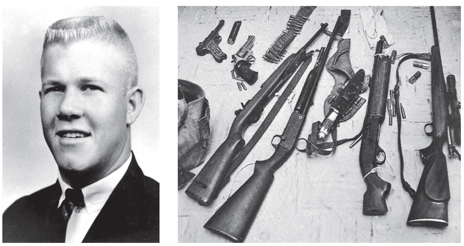 В США вооруженные нападения на учебные организации по-прежнему очень актуальны и драматичны, что подтверждает случай расстрела людей на территории вуза, который произошел 01.08.1966 г. в г. Остин (штат Техас), где Чарльз Джозеф Уитмен (рис. 1) на территории Техасского университета (со смотровой площадке башни) устроил стрельбу по людям. В тот день Чарльз убил 11 человек и ранил 31, прежде чем он был застрелен полицией. Как выяснилось позже, прежде чем выехать в студенческий кампус, он заколол свою мать и жену. Также он застрелил несколько человек во время подъема на башню. В общей сложно‑ сти им было убито 16 человек [28, 29].