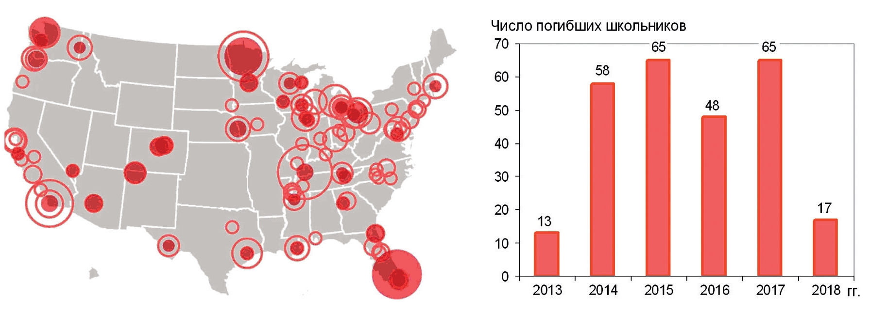 Рис. 2. Территории в США, где были совершены вооруженные нападения в школах, и динамика числа погибших школьников.