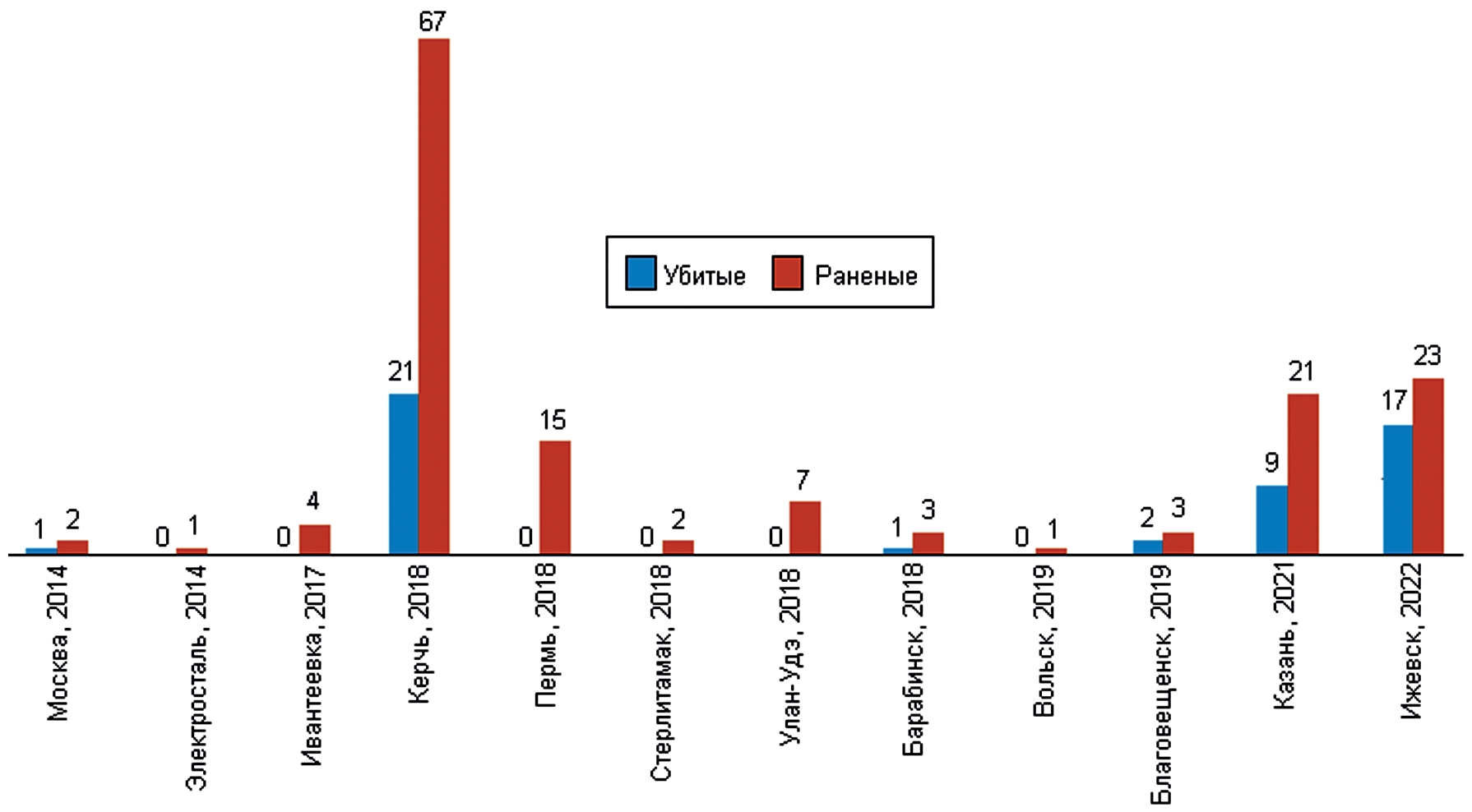 Большинство из них были совершены в США, в меньшей степени они происходили в странах Европы и Азии. Вместе с тем, начиная с 2014 г., в России отмечается неуклонный рост вооруженных нападений на школы и вузы [2, 3, 8].