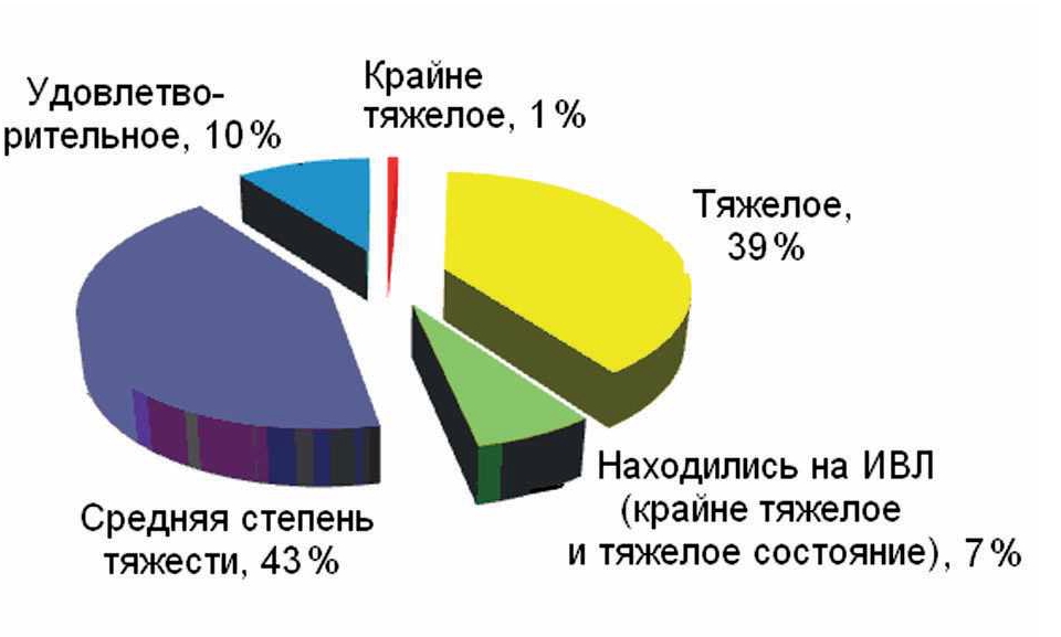Данные о числе пострадавших, транспортируемых в другие стационары, и видах полученных ими травм представлены в табл. 1, структура тяжести состояния пострадавших – на рис. 2.