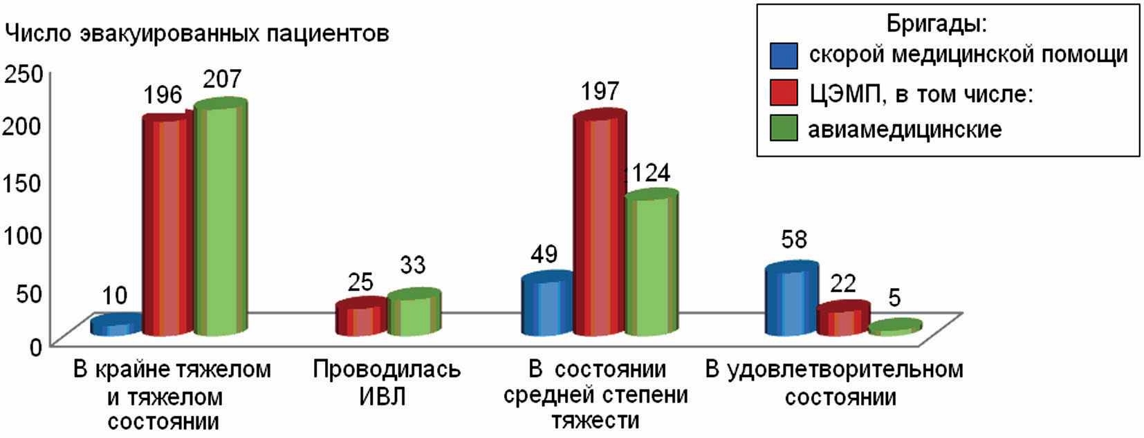 Начиная с 2018 г., когда специализированные бригады ЦЭМП были переоснащены современной аппаратурой [мониторефибриллятор с функцией электрокардиостимулятора «Corpuls-3», аппараты искусственной вентиляции легких (ИВЛ) «LTV-1200 Pulmonetic» и «Hamilton», устройства автоматические для сердечно-легочной реанимации «AutoPulse» и «Lucas» и др.], получена возможность проведения интенсивной терапии в максимально полном объеме в пути следования и, соответственно, безопасной транспортировки крайне тяжелых пациентов на значительные расстояния, когда время в пути составляло более 4–6 ч. Это позволило осуществлять межбольничные переводы пострадавших не только из медицинских организаций и сопредельных областей, но и из более удаленных регионов (Псковская обл., г. Иваново и т.д.) как силами авиамедицинских бригад, так и наземным транспортом бригадами анестезиологии и реанимации.