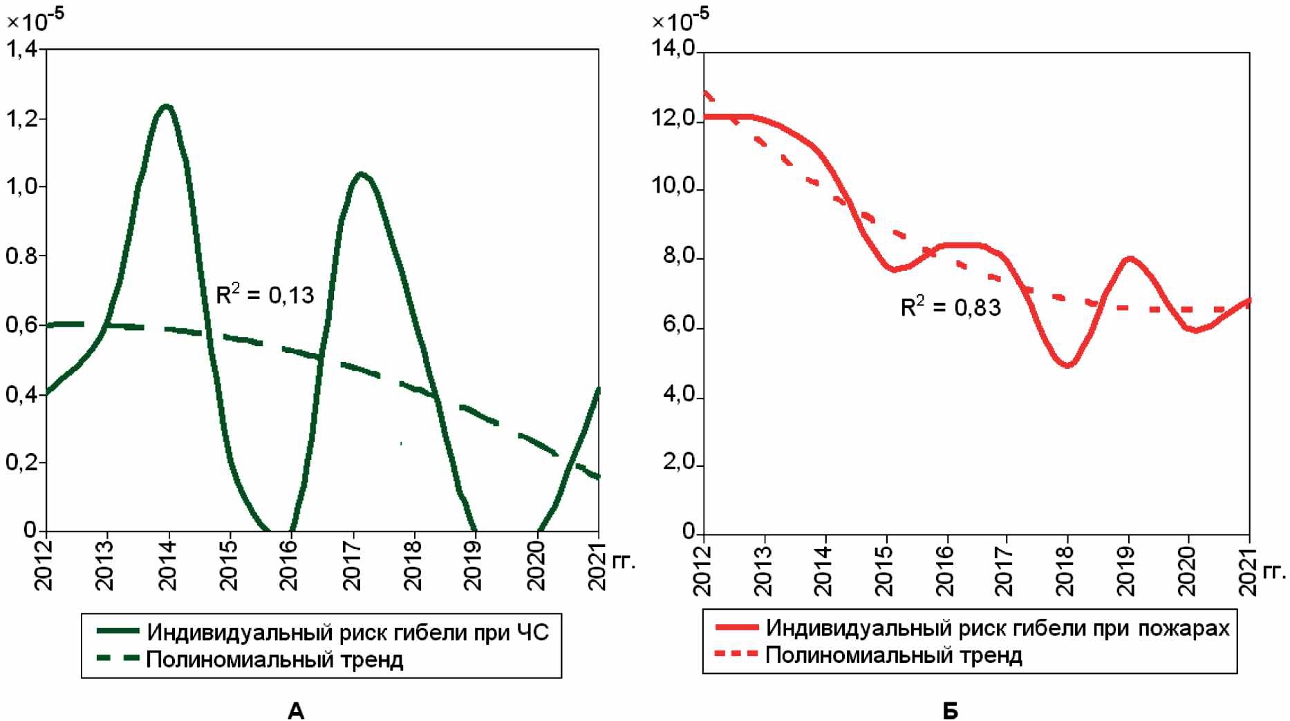 Среднегодовые показатели погибших при пожарах за период 2012–2021 гг. – (39 [33; 53]) человек, R при пожарах – (7,97 [6, 82; 10, 85]) • 10⁻⁵ смертей/(человек • год), материального ущерба от пожаров – 49,8 [29, 4; 120, 4]) млн руб. При высоком коэффициенте детерминации полиномиальный тренд (R2 = 0,83) показывает уменьшение показателей в течение анализируемого периода (см. рис. 5Б).