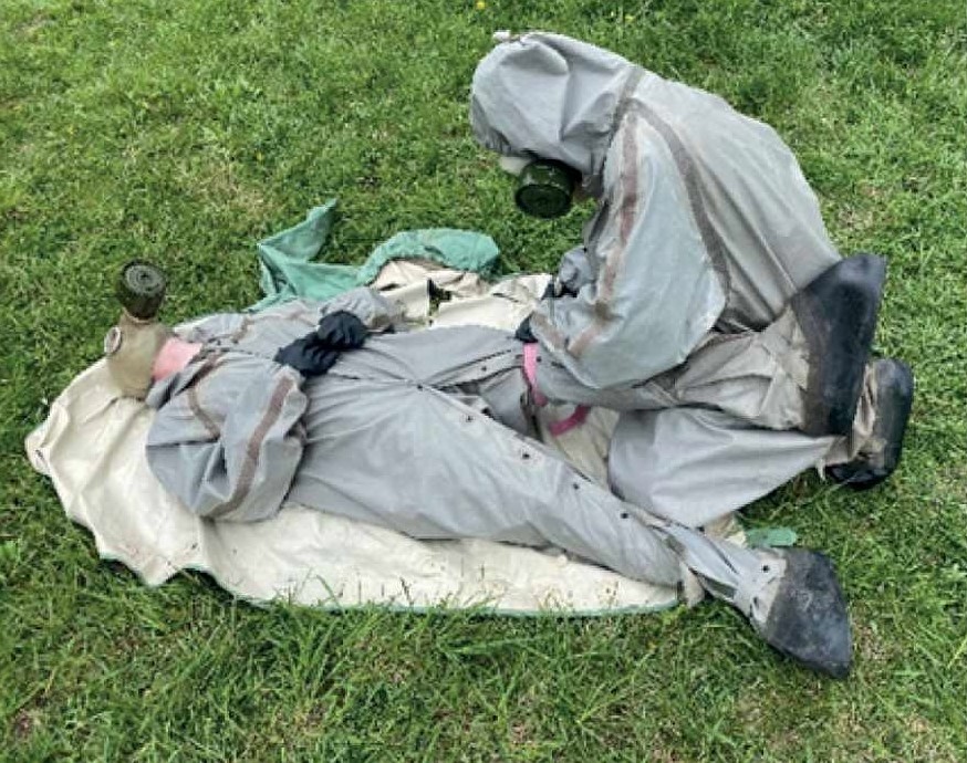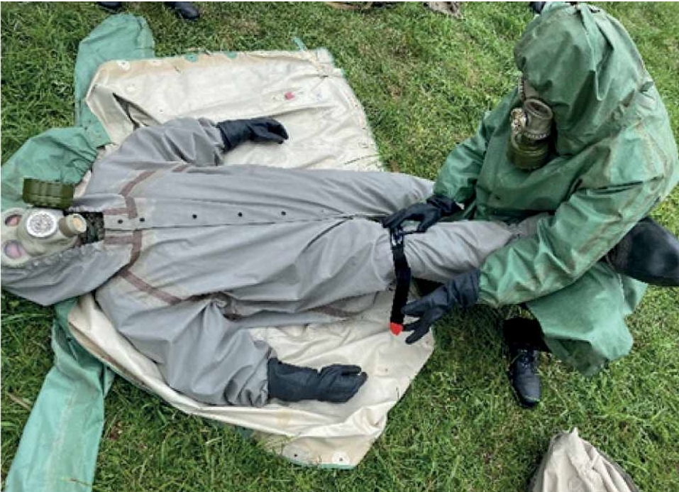 - на 2-м этапе на «спасателях» и условно-«пострадавших» были надеты СИЗ органов дыхания – противогаз и кожи – общевойсковой защитный костюм – группы «Жгут-СИЗ (спасатель и пострадавший)» (рис. 3) и «ТурникетСИЗ (спасатель и пострадавший)» соответственно (рис. 4).