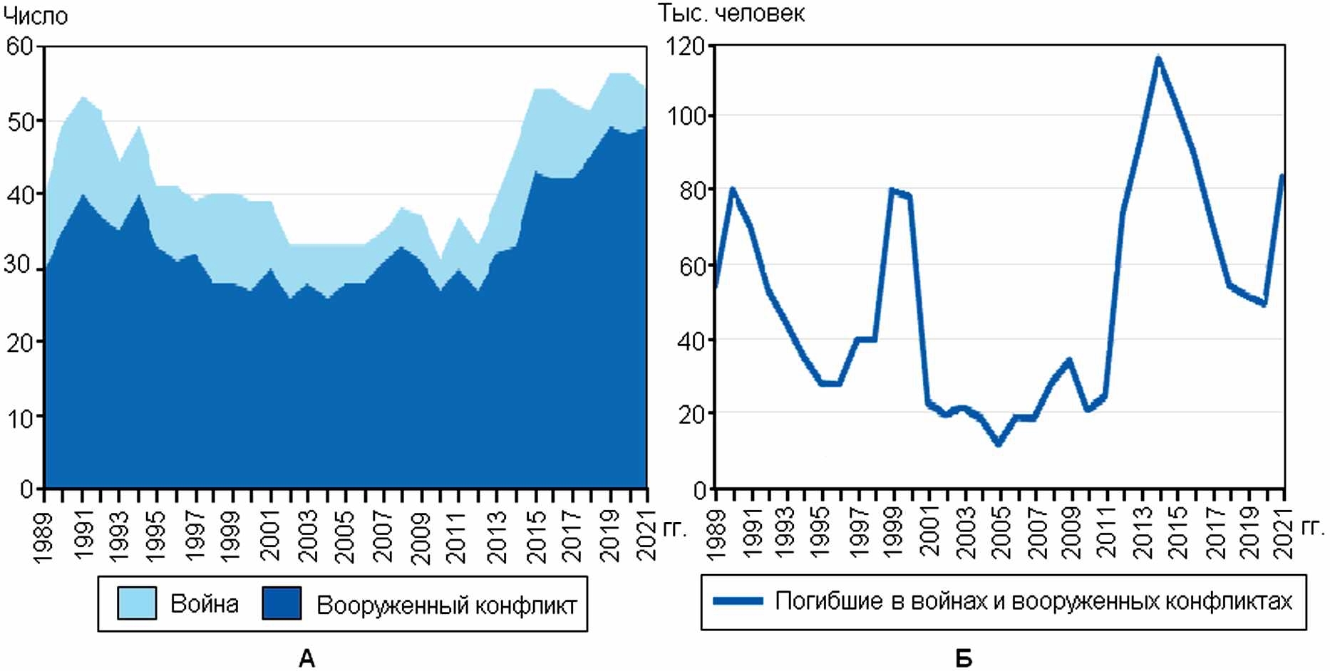 Рис. 1. Динамика войн и вооруженных конфликтов в мире (А) и погибших в них (Б) (адаптировано по [13]).