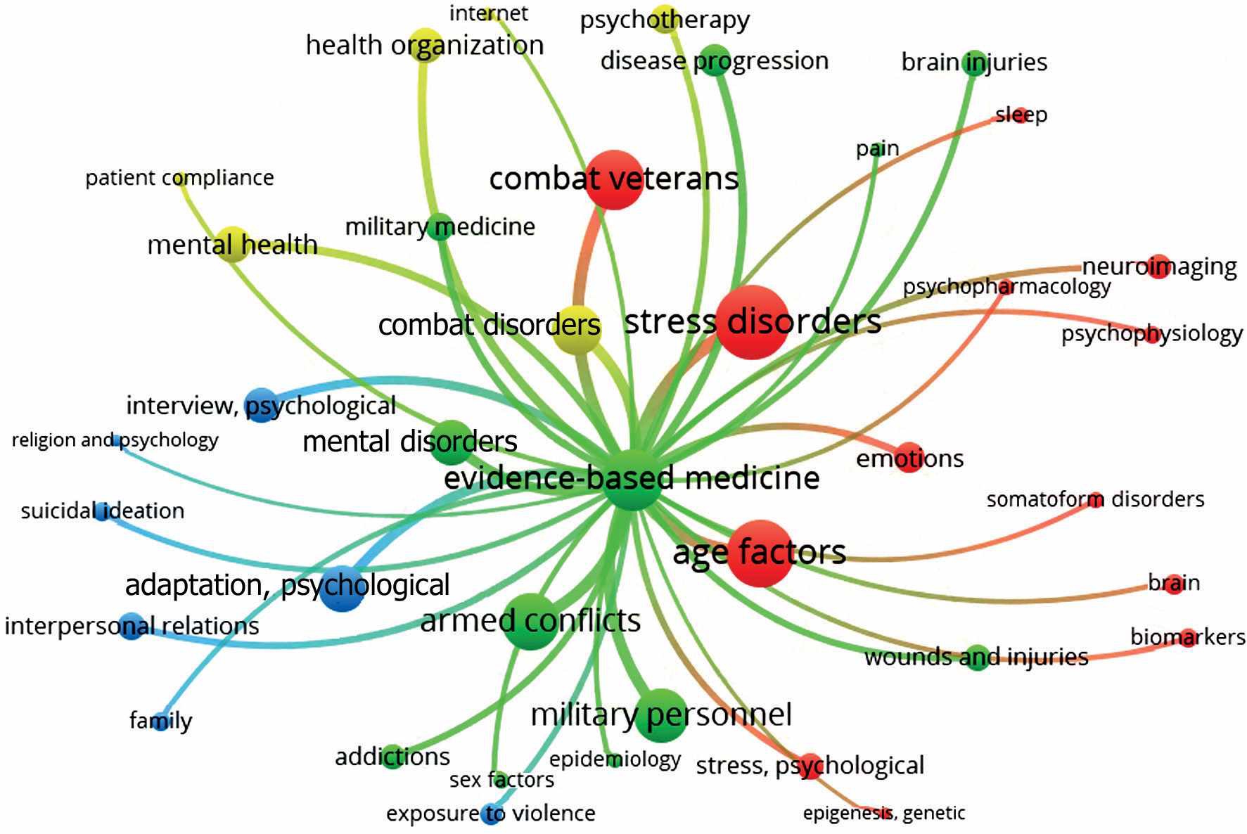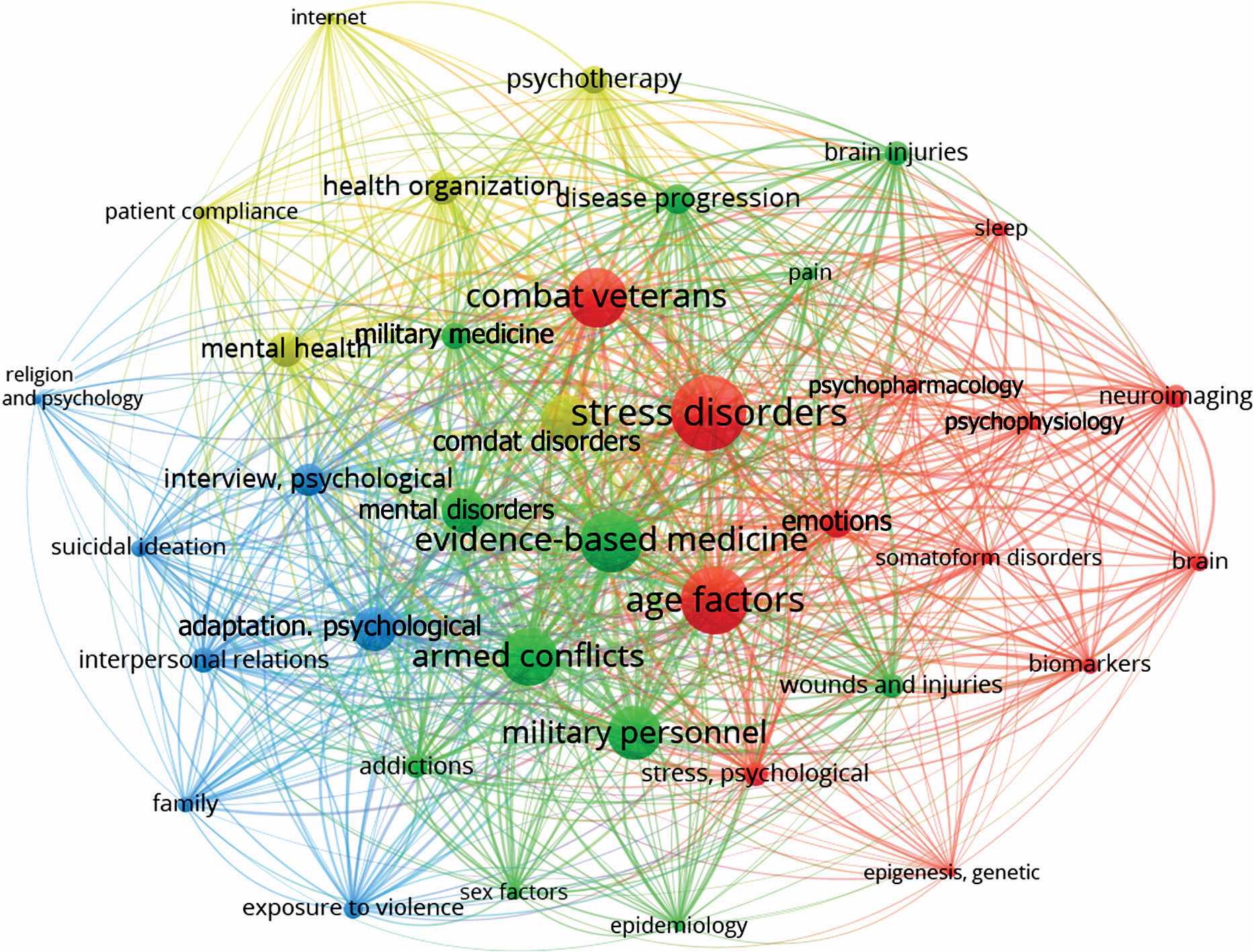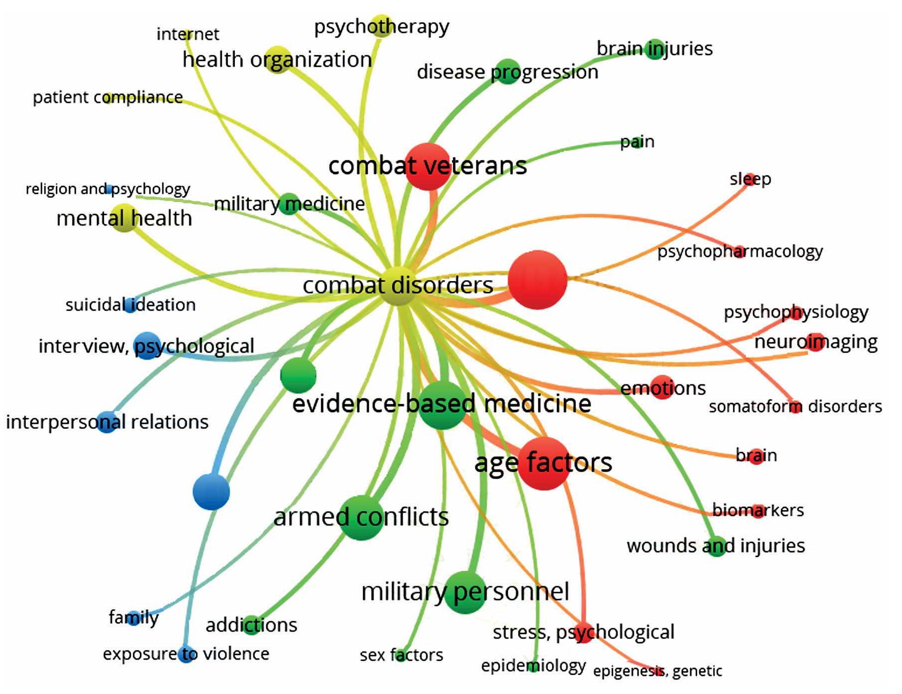 Результаты и их анализ. Объединенные понятия разделили на 4 кластера. В 1-й кластер вошли статьи, авторы которых изучали в основном маркеры проявлений острых и хронических стрессовых расстройств у ветеранов боевых действий. Общая сила связи ключевых слов составила 36,8 % от структуры в общем массиве публикаций. 2-й кластер составили статьи, в которых анализировались нарушения здоровья у военнослужащих при вооруженных конфликтах, сопровождаемых развитием боевого стресса, с позиций доказательной медицины с общей силой связи 36,5 %. 3-й кластер объединил статьи с минимизацией боевых расстройств и включал в себя первую медицинскую помощь, доступность и своевременность оказания медицинских услуг, и другие показатели организации здравоохранения, в том числе, военной медицины, психотерапевтическую и «комбинированную» терапию с общей силой связи 14,3 %. В содержании статей 4-го кластера группировались ключевые слова, которые определяли психологическую адаптацию респондентов при боевом стрессе с общей силой связи 12,4 %. Большинство статей опубликованы учеными из США, работающими в учреждениях Министерства по делам ветеранов (United States Department of Veterans Affairs).