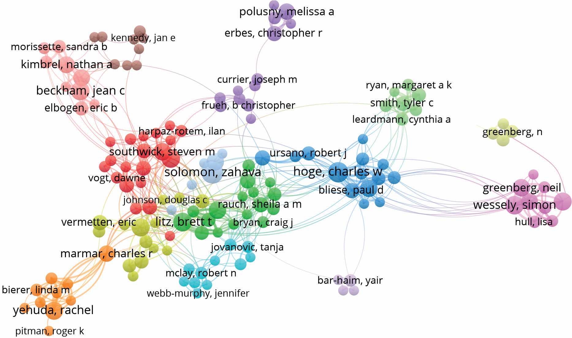 Рис. 10. Основные кластеры научных соавторств в иностранных публикациях по боевому стрессу.