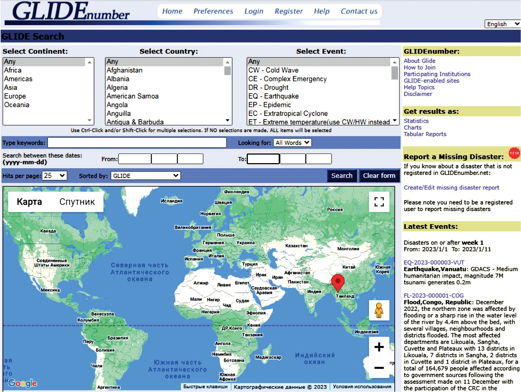 Рис. 4. Начальная страница поиска сведений о ЧС в мире по данным БД GLIDE.