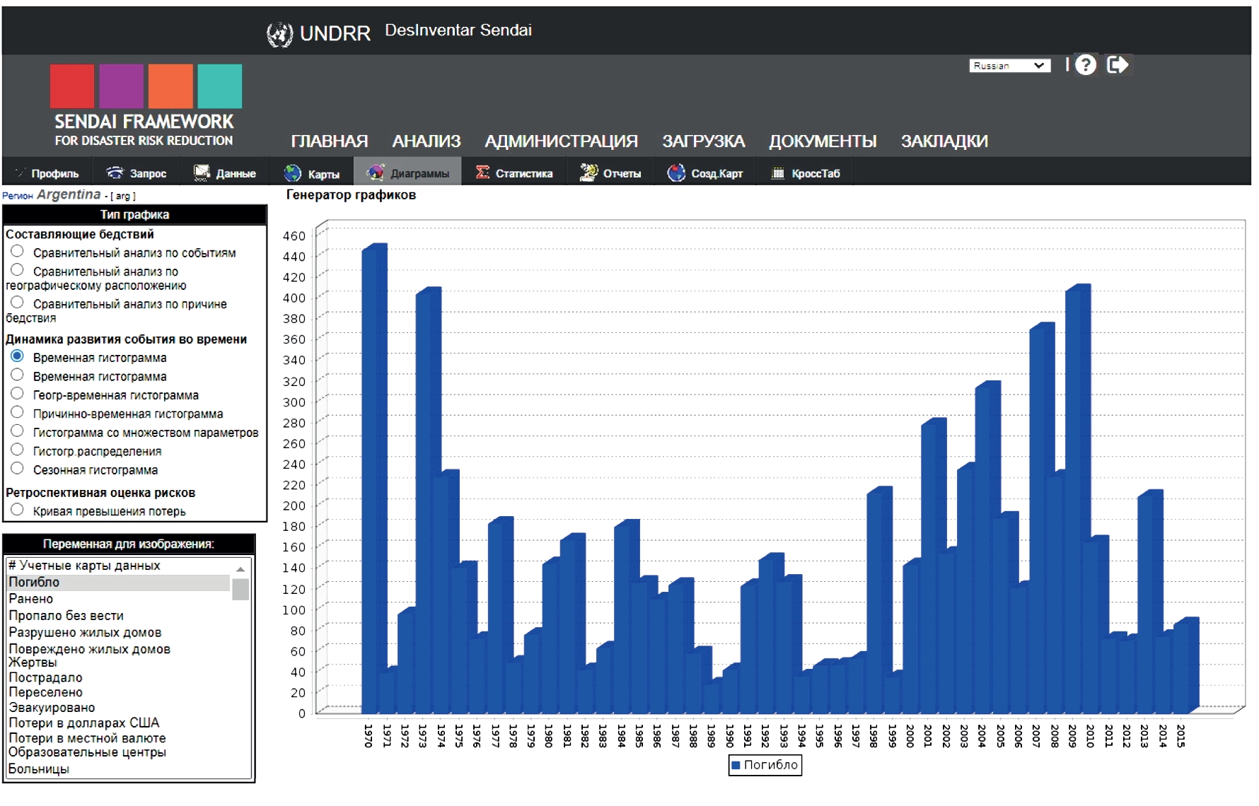В настоящее время в DesInventar поддерживается информация о ЧС, происходящих более чем в 85 странах, в том числе, в некоторых европейских странах. БД включает в себя два основных компонента (модуля). Модуль администрирования и ввода данных используется для пополнения БД информацией о ЧС ответственными лицами. Модуль анализа позволяет получить доступ к базе данных для широкого круга пользователей (раздел «Analyze») с возможностью выбора страны, провести анализ числа и типа ЧС, в том числе, количества погибших, раненых, пропавших без вести, переселенных лиц, о экономических потерях, которые даются в таблицах MS Excel, графиках и тематических картах. Доступный временной диапазон статистических данных зависит от конкретной страны, в основном содержит данные после 1970 г. Для специалистов из стран Союза независимых государств (СНГ) есть возможность ознакомления и загрузки материалов на русском языке (рис. 5).