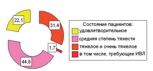 При поступлении в приемные отделения у 426 пациентов (71 %) состояние расценено как тяжелое и крайне тяжелое, что более чем в 2 раза превышало процент пострадавших при первичном осмотре. Все пострадавшие находились в шоке. Тяжесть состояния была обусловлена наличием комбинированной травмы (ожоги кожных покровов более 30 % поверхности тела, ингаляционная травма II–III степени, отравление продуктами горения, переломы крупных сегментов конечностей).