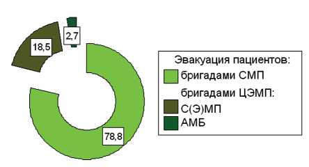 Рис. 2. Доля участия бригад СМП, С(Э)МП ЦЭМП, в том числе, АМБ в проведении медицинской эвакуации пострадавших с термическими ожогами в крайне тяжелом и тяжелом состоянии
