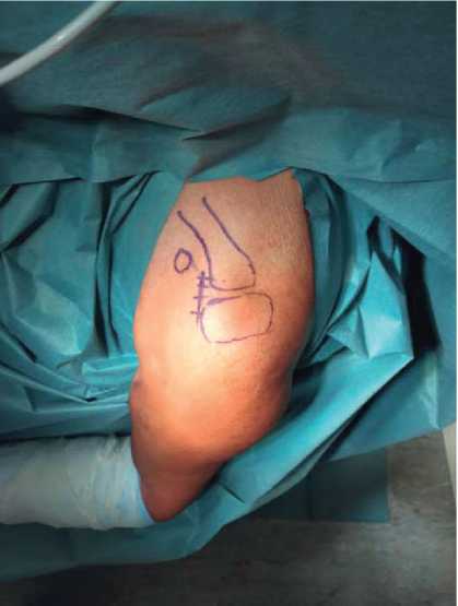 Применяли миниинвазивный доступ длиной 4–6 см на 1 см кпереди от акромиального отростка (рис. 2), послойно рассекали кожу, подкожную клетчатку, дельтовидную мышцу вдоль волокон; прошивание вращательной манжеты ротаторов осуществляли с дальнейшем рассечением ее по интервалу ротаторов и фиксацией на «держалки» (рис. 3), что обеспечивало доступ к суставной поверхности головки плечевой кости (точке введения штифта) [7]. Данную методику выполняли при переломах типа С и застарелых переломах типа В по АО.