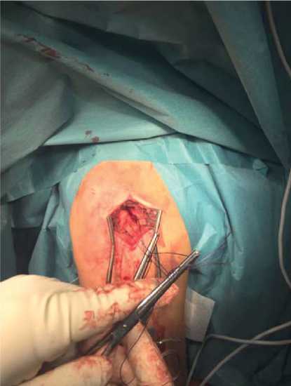 Рис. 3. Хирургический доступ. Кожа и подкожная жировая клетчатка рассечены. Сухожилия манжеты ротаторов прошиты и взяты на «держалки»