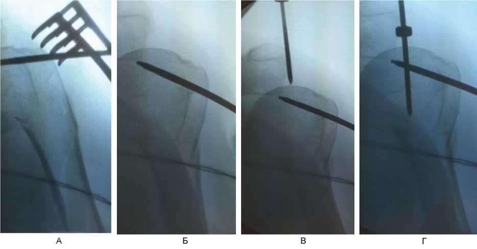 Рис. 4. Непрямая репозиция под рентгенологическим контролем (ЭОП) с помощью спиц-джойстиков при переломах типа А и В по АО. А – установка толстой спицы-джойстика в проксимальный отломок; Б – репозиция варусного отклонения проксимального отломка; В – выбор точки для вскрытия интрамедуллярного канала плечевой кости под имплантат; Г – контроль положения направителя для вскрытия интрамедуллярного канала плечевой кости