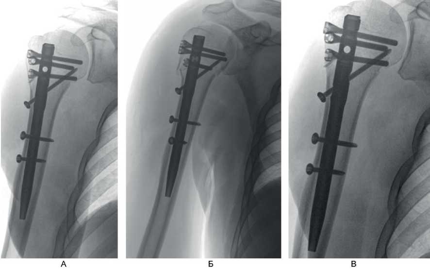 Благодаря конструктивным характеристикам штифты последнего поколения применимы при разном состоянии костной ткани и различных типах переломов. Так, для пациентов с низкой плотностью костной ткани их применение оправдано, поскольку данные штифты имеют в канале полипропиленовый вкладыш, который обеспечивает дополнительную стабилизацию блокируемых винтов (рис. 11А). В случае перелома хирургической шейки плеча (переломы типа В и С по классификации АО), когда отмечаются дефект по медиальной поверхности и оскольчатый характер перелома в калькарной области, требуется стабилизация латеральной и медиальной колонн. Применение современных штифтов в данной ситуации позволяет без технических трудностей добиться медиальной устойчивости, так как расположение самого штифта внутри канала обеспечивает стабильность латеральной и медиальной стенок плеча, к тому же полиаксиальное расположение винтов в головке плечевой кости и введение калькарного винта создают дополнительную опору в медальном отделе (см. рис. 11Б). При переломах хирургической шейки плечевой кости с расколом на диафизарную часть длинные версии штифтов позволяют применять малоинвазивную методику (см. рис. 11В).