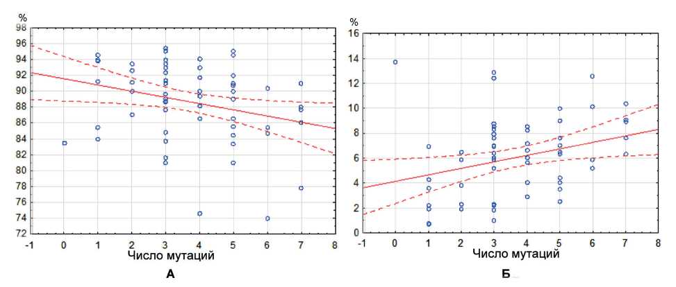 Рис. 1. Сопоставление результатов оценки наличия в генотипе минорных аллелей генов исследованных цитокинов и содержания в периферической крови классических (А) и неклассических (Б) субпопуляций моноцитов. Классические моноциты (CD14+CD16–) = 91,5–0,78 (количество мутаций), 95 % доверительный интервал. Неклассические моноциты (CD14+dimCD16+) = 4,14 + 0,52 (количество мутаций), 95 % доверительный интервал