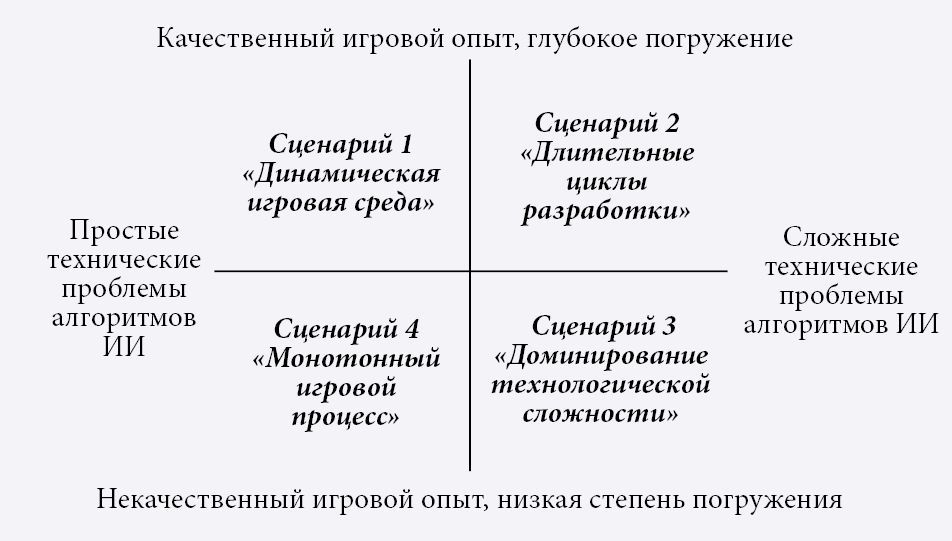 Сценарий 3 — «Доминирование технологической сложности». Предполагается, что при сочетании существенных проблем алгоритмов ИИ и низкого уровня погружения в игровой процесс разработчикам придется уделять избыточное внимание техническим аспектам. Это влечет за собой риски лишиться потребителей, которых интересуют не столько технологические инновации, сколько привлекательность процесса. Избыточная ставка на технологическую сложность чревата потерей эффекта погружения и увлекательного игрового опыта, которого ожидали игроки. Возрастает вероятность утраты таких атрибутов, отвечающих за интерес к игре, как захватывающий сюжет, детально проработанный игровой мир и интуитивный интерфейс. Следовательно, вероятность реализации сценария может оказаться невысокой, поскольку она зависит от баланса между технологическими инновациями и игровым процессом, а увлечение совершенствованием алгоритмов ИИ способно его нарушить.
