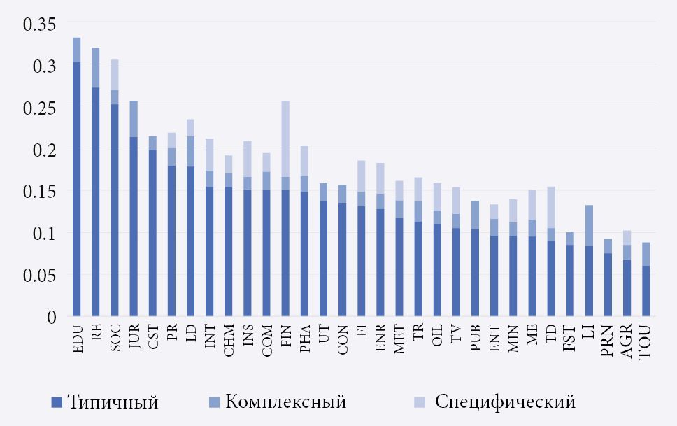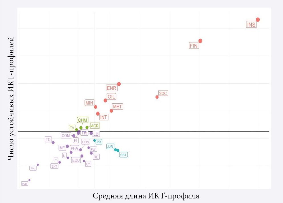 Высокий уровень разнообразия и сложности применяемых ИКТ-профилей может свидетельствовать о развитой отраслевой ИКТ-архитектуре. Безусловное лидерство по данному критерию удерживают страхование (INS) и финансовые услуги (FIN). В этом же квадранте находятся общественное управление (SOC), паро-, газо- и электроснабжение (ENR), добыча и переработка нефти (OIL), металлургическое производство (MET), сектор ИКТ (INT), добыча прочих полезных ископаемых (MIN). На другом полюсе — отрасли с однородными ИКТ-профилями с небольшим набором технологий: деятельность общественных организаций (PUB), гостиничное дело (TOU) и т. д., которые находятся в левом нижнем квадранте матрицы, представленной на рис. 1. Несмотря на визуальную положительную связь между разнообразием и сложностью ИКТ-профилей на отраслевом уровне, можно выделить две отрасли, которые характеризуются преобладанием однородных профилей с большим набором ИКТ: консультирование по вопросам управления (CST) и юридические услуги (JUR).