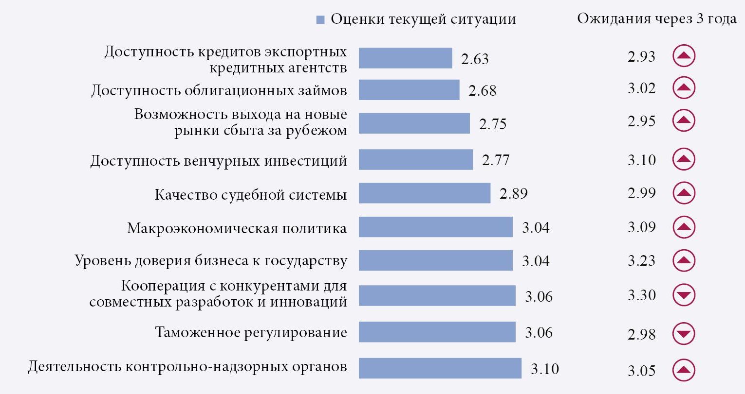 В зависимости от степени вовлеченности в инновационную и экспортную деятельность значимо различается восприятие компаниями ключевых дефектов деловой среды. Для организаций-инноваторов, интегрированных в глобальные цепочки создания стоимости, ключевые барьеры связаны с сужением возможностей взаимодействия с конкурентами при выполнении ИиР (особенно актуально для хайтек-предприятий), а также со сравнительно низким уровнем доверия к действиям властей. Активизацию экспорта инновационных компаний в большей степени ограничивают несовершенство таможенного регулирования и трудности привлечения внешнего финансирования (ресурсов экспортных кредитных организаций, облигационных займов и венчурных инвестиций). Помимо финансовых ограничений инновационной деятельности препятствует еще и негативное восприятие топ-менеджментом условий освоения новых, особенно зарубежных, рынков сбыта.