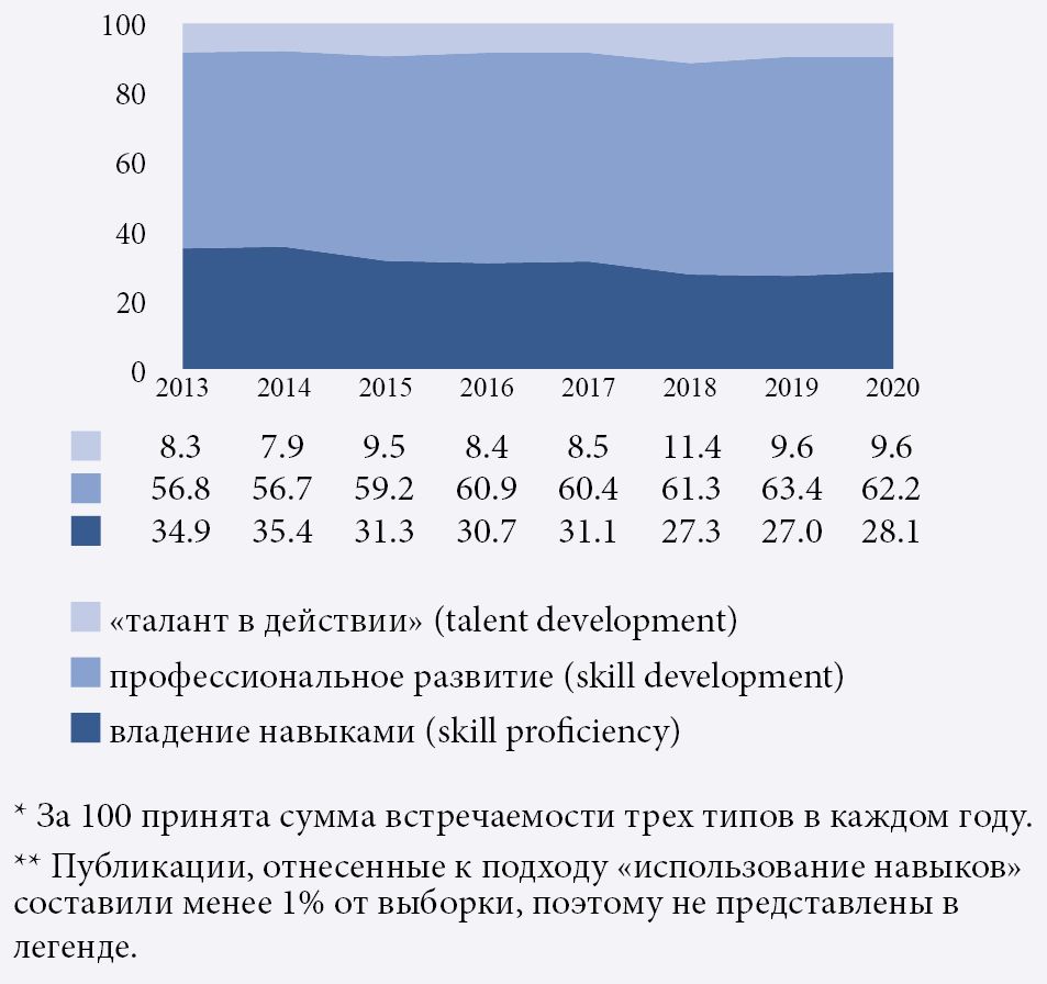 - Тип подхода (дискурса) о навыках и человеческом потенциале: (a) владение навыками (skill proficiency), (b) применение навыков (skill use), (c) развитие навыков / профессиональное развитие (skill development), (d) «талант в действии» (talent development). Кодировка проводилась с опорой на ключевые слова (теги). Для кодировки подхода «владение навыками» использовались следующие теги: “skill level”, “skill proficiency”, “skill supply”, “stock of skills”, “skill deficit”, “skill shortage”. Для кодировки подхода «использование навыков»: “skill utilization” и “skill use”. Для кодировки подхода «развитие навыков/профессиональное развитие» применялись теги, которыми кодировался подход: “skill development”; для подхода «талант в действии»: “talent development” и “employee development”. В случае ручной кодировки (для всех описанных выше элементов выборки, кроме массива данных, полученных с помощью iFORA) различение подходов «развитие навыков» и «талант в действии», в силу их содержательной близости, дополнительно проводилось следующим образом. К подходу «талант в действии» были отнесены публикации при одновременном соблюдении двух условий: обсуждение в работе, во-первых, вопросов развития и /или оценки набора навыков, а не отдельного навыка; во-вторых — возможности мониторинга прогресса человека, его производительности/продуктивности.