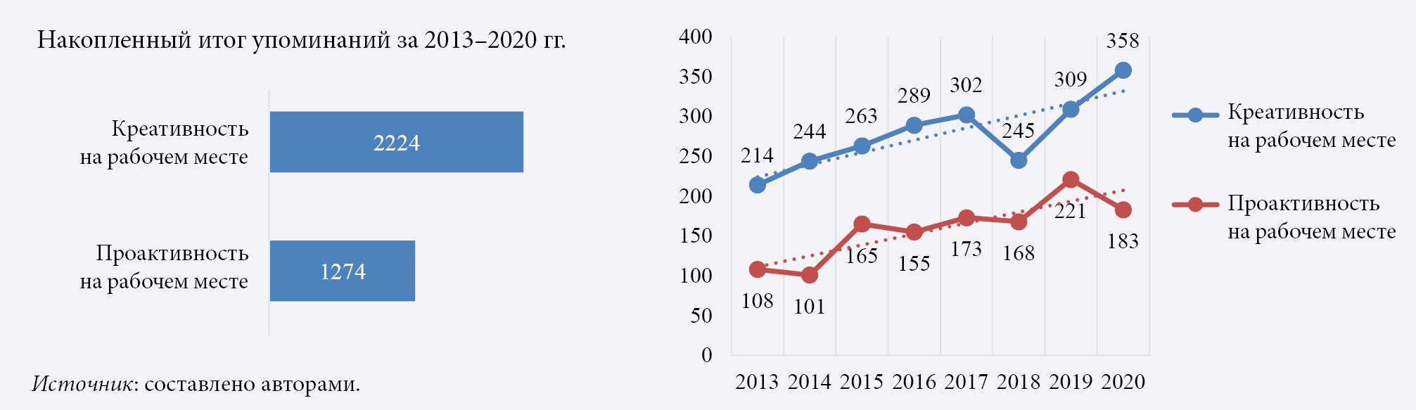 Корпоративный сектор предъявляет наиболее решительные требования к развитию человека, рассматривая своих сотрудников в качестве ключевого актива и источника новой стоимости (Oppong et al., 2019). Потребность компаний в технологических инновациях и трансформации бизнес-процессов стимулирует политику корпоративного предпринимательства, основанную на поддержке инновационного и проактивного поведения работников через создание благоприятствующей среды (Urbano et al., 2022). Поэтому именно компании выступают главными пропонентами новой парадигмы развития и оценки человеческого потенциала (Cappelli, Tavis, 2016), опирающейся на проактивную роль индивида в его самосовершенствовании. Нами зафиксирована экспансия тематики проактивности и креативности на рабочем месте в научной повестке в 2013–2020 гг. (рис. 4). Оба этих элемента остаются комплексными конструктами, не сводимыми к набору отдельных, не связанных между собой навыков (Corazza et al., 2022), а их основной метрикой служит фактическая деятельность и производительность. Однако нарратив владения конкретными навыками сохраняет свое значение для компаний как концептуальный фундамент развития и оценки человеческого потенциала, особенно на этапе рекрутинга. Рынок HRtech предлагает сотни решений в этой области10 (KPMG, 2022).