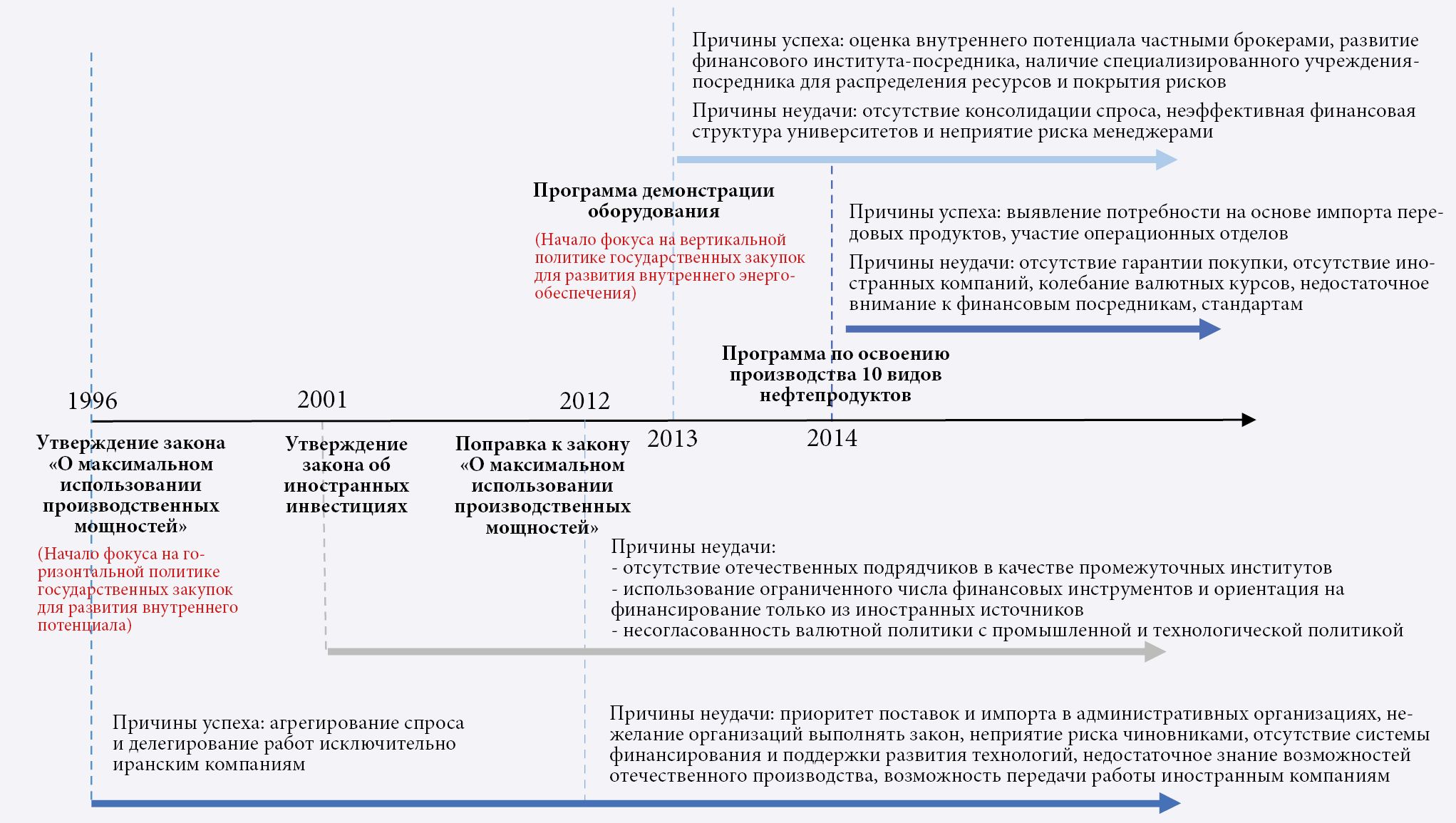 В рамках обычных и непроектных госзакупок, а также инициатив негосударственных учреждений реализация закона была не очень успешной, в том числе по таким направлениям, как привлечение иностранного финансирования и использование зарубежных валютных резервов, тендеры, строительные проекты и т. д. Как следствие, в 2018 г. закон подвергся корректировке. В Приложении 2 сравниваются категории, упоминаемые в проведенных интервью, и пункты исходного закона, перешедшие в новую редакцию. По мнению большинства экспертов, закон не мог работать должным образом, был недостаточно эффективен для реализации внутреннего потенциала и оказал лишь ограниченное воздействие на цепочку производства стали в Иране (Attarpour et al., 2023).