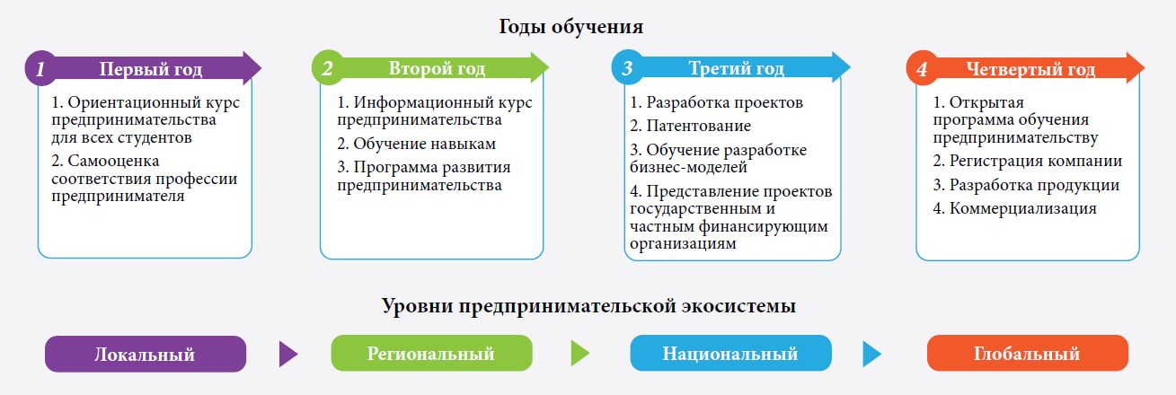 Программа рассчитана на технические специальности и охватывает весь четырехлетний период обучения в бакалавриате. По мере накопления компетенций в рамках существующих компаний, создавая собственные стартапы, студенты последовательно продвигаются по иерархии предпринимательских экосистем — от локального (начального) уровня до глобального. На всех этапах действуют всевозможные системные механизмы поддержки — консультативные, финансовые, инфраструктурные и др. (табл. 1). Программа создана таким образом, чтобы студенты, поднимаясь все выше, правильно охватывали растущее многообразие коммуникационных сетей, умело взаимодействуя в сложных системах и расширенных контекстах. В такой последовательности интенсивно развивается предпринимательское мышление, происходит постепенная адаптация к более крупным рынкам и интенсивной конкурентной среде. Знакомство и умение работать с разными уровнями и типами предпринимательских экосистем способствует наращиванию человеческого потенциала инновационных предпринимателей с разносторонним бэкграундом. Общая схема реализации программы по годам обучения отражена на рис. 1.