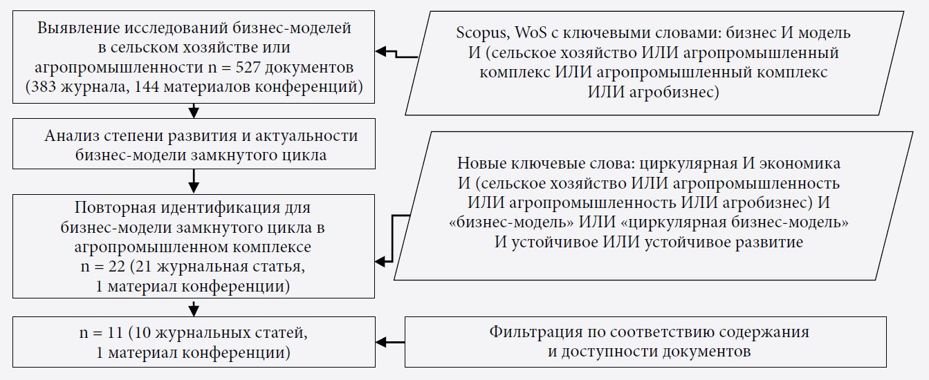 Рис. 2. Блок-схема процедуры поиска статей об использовании бизнес-моделей замкнутого цикла в агробизнесе/агропромышленности