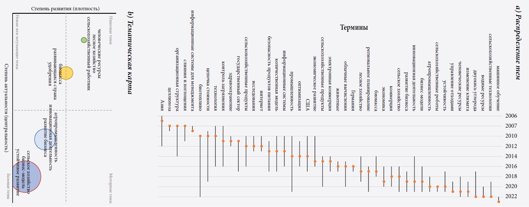 Рис. 3. Распределение тем и тематические карты (ключевое слово плюс название) исследований бизнес-моделей в сельскохозяйственном секторе