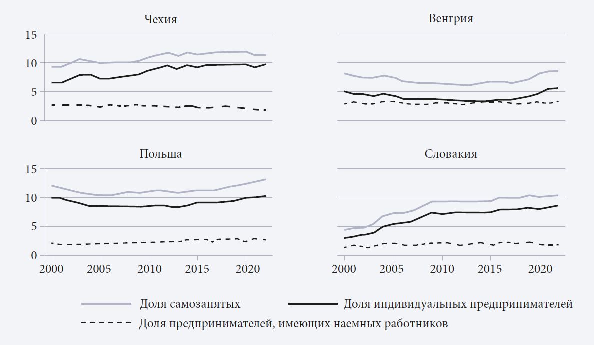Цель настоящей статьи состоит в анализе масштаба и структуры предпринимательской деятельности в Чехии, Венгрии, Польше и Словакии за трехлетний период после начала пандемии COVID-19. Контекст исследуемых стран определяется их общей посткоммунистической историей, открытой рыночной экономикой, небольшими размерами, членством в Европейском Союзе (ЕС) и Вышеградской группе. В отличие от других членов ЕС, после слома политической системы в начале 1990-х гг. эти страны создавали рыночные институты с нуля, что обусловило некоторое отставание от развитых западных экономик. Оно проявляется в структурных условиях ведения бизнеса и формировании экосистемы, определяющей качество деловой среды, предпринимательской активности и ее вклад в экономическое развитие (Bruothová, Hurný, 2016; Sacio-Szymańska et al., 2016; Dvouletý, Orel, 2020; Jabłońska, Fila, 2021; Csákné Filep et al., 2023).