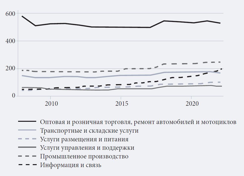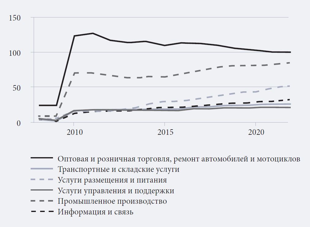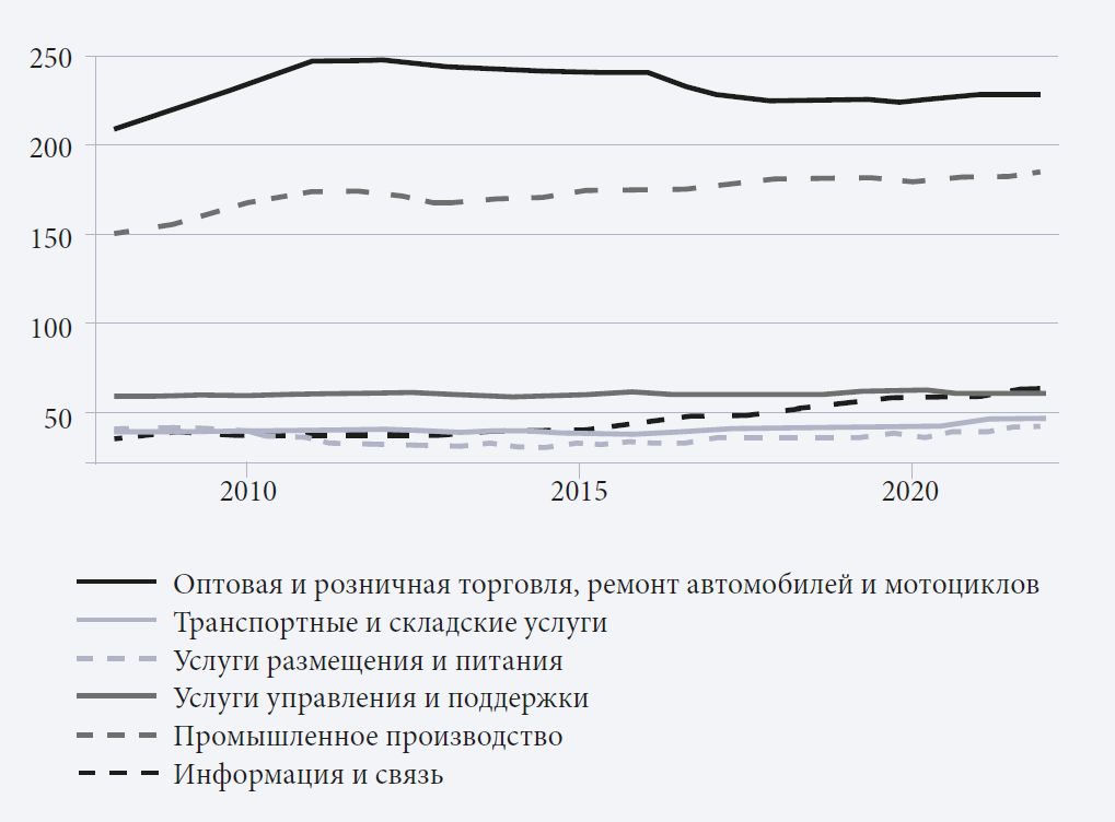 Далее приведена динамика числа действующих предприятий в ключевых отраслях (оптовая и розничная торговля; ремонт автомобилей и мотоциклов; услуги размещения и питания; транспорт и складирование; промышленное производство; услуги управления и поддержки; информация и связь). Для наглядности динамика каждой страны представлена отдельно (рис. 2–5); средние значения показателей даны в табл. 1. Примечателен рост сектора информации и связи, обусловленный всплеском спроса на инновационные решения в сфере удаленных покупок и работы в условиях изоляции (Storr et al., 2021; Sánchez-Vergara et al., 2023). Примечательно, что после 2020 г. существенного снижения показателей не произошло: вопреки ожиданиям масштабной ликвидации предприятий в наиболее пострадавших от ограничений секторах (Dvouletý et al., 2021; Gerwe, 2021), таких как услуги размещения и питания, графики этого не подтверждают. В статистико-аналитическом разделе далее предложено описание эмпирического подхода и полученных результатов.