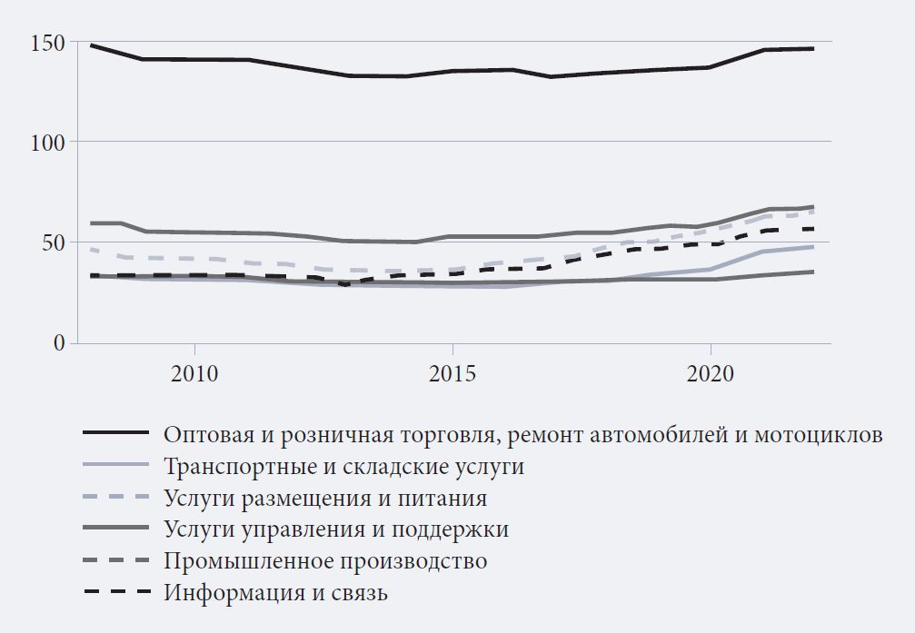 Выбор адекватных показателей и нехватка данных стали основными ограничениями для настоящего исследования, основанного на гармонизированной статистике Евростата (Eurostat, 2023a, 2023b, 2023c, 2023d). Для получения целостной картины развития предпринимательства после пандемии применялись несколько показателей, преимущественно из «Обследования рабочей силы Европейского Союза» (ОРС ЕС) (Eurostat, 2023a, 2023b). Они характеризуют присутствие на рынке труда различных категорий граждан — самозанятых, ИП и предпринимателей с наемными работниками, — выраженное в долях экономически активного населения (15–64 лет) (Dvouletý, Orel, 2020; Audretsch, Belitski, 2021), что позволило оценить уровень высококачественного предпринимательства (Urbano et al., 2017). Также использовались данные СБС Евростата (Eurostat, 2023c, 2023d) о количестве зарегистрированных субъектов предпринимательской деятельности в отдельных секторах (Henrekson, Sanandaji, 2020). Однако, несмотря на все усилия Евростата по гармонизации данных, сохраняются структурные разрывы в определении некоторых показателей на основе NACE 2020, из-за чего интегральные индикаторы экономик в целом оказались несопоставимыми и анализ ограничился отраслями с неизменной методологией расчета числа предприятий.