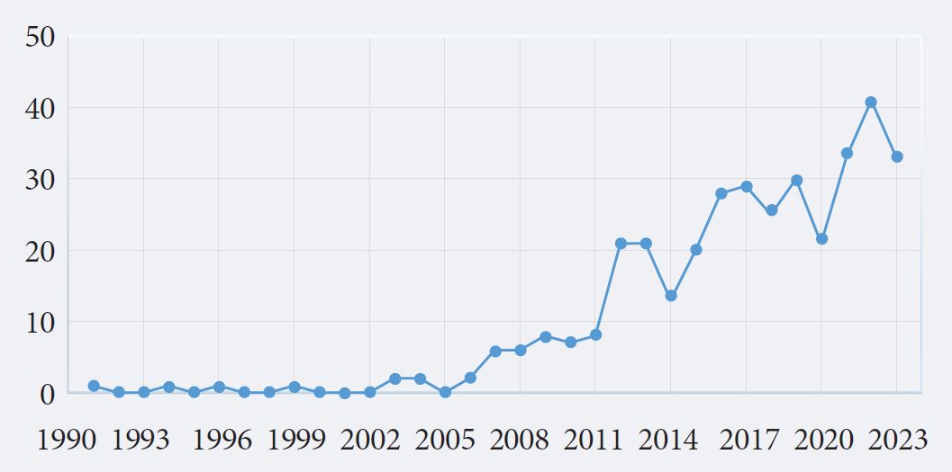 На третьем этапе на основании анализа аннотаций с помощью ручной фильтрации были удалены 185 статей, которые не отвечали тематике исследования или носили, по нашему мнению, ненаучный характер. В результате выборка сократилась до 360 статей. На рис. 1 представлено распределение по годам, отражающее постоянный рост числа публикаций по теме предпринимательства в российских научных журналах. В период 2010–2023 гг. были опубликованы 323 статьи — в 10 раз больше, чем за предыдущее десятилетие. Наибольшая публикационная активность по тематике пришлась на 2022 г. (41 публикация), 2023 и 2021 гг. (по 33 публикации) и 2019 г. (30 публикаций). Такая динамика отражает, во-первых, тот этап, на котором находится частное предпринимательство после периода становления 1990-х гг. (накопление опыта, практики и т. п.), а во-вторых, оформление изучения предпринимательства в отдельную исследовательскую программу российских ученых (накопление ими эмпирического материала и методического опыта).