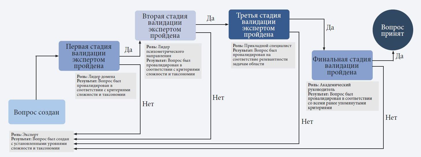В рамках перечисленных принципов каждое из заданий было создано академическим экспертом в конкретной области, а затем проверено специалистом-психометриком на соответствие классической теории измерения. Вопросы валидировались тремя независимыми экспертами (рис. 3). С помощью созданного набора вопросов оценивались само качество фундаментальных знаний, их сочетаемость и возможность применения в различных контекстах, зачастую неординарных. Разработанная таксономия предназначалась для проверки возможностей языковых моделей на разных уровнях — от запоминания и воспроизведения знаний до их практического применения.