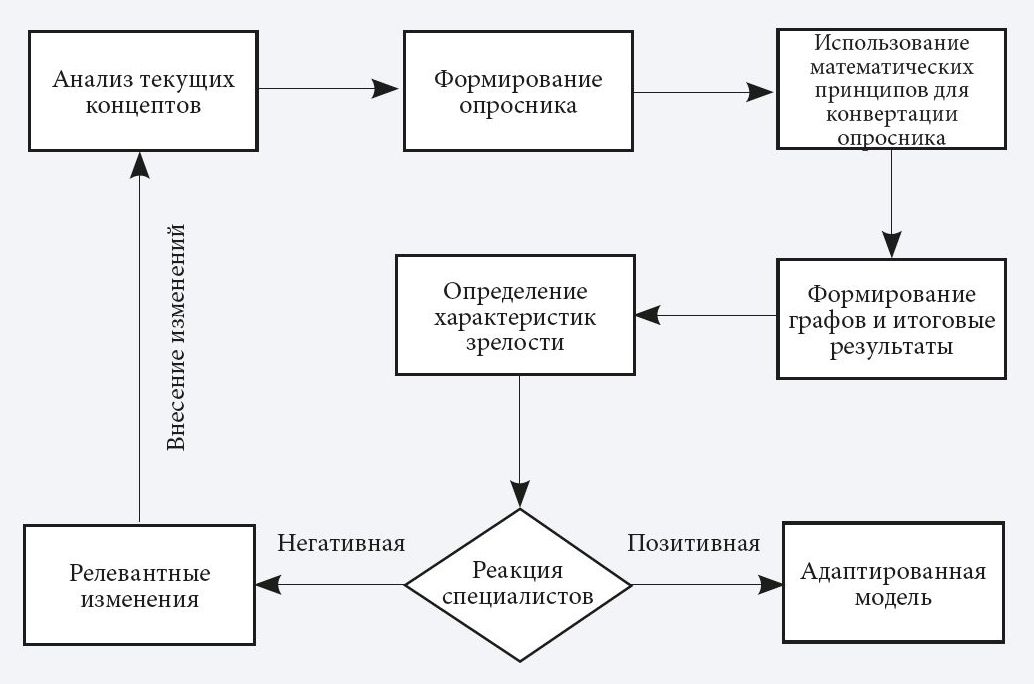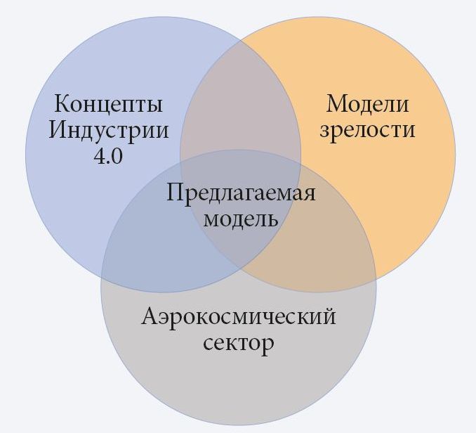 На рис. 2 отражена взаимосвязь между концепцией Индустрии 4.0, моделями зрелости и аэрокосмическим сектором. Перекрывающиеся круги — позиция расположения предлагаемого метода, отражающая его синтетическую природу. Этапы создания модели проиллюстрированы на рис. 3. Особое значение имела разработка реалистичной и надежной анкеты, поэтому помимо изучения литературы проводился опрос для получения обратной связи от специалистов из научной сферы и бизнеса.