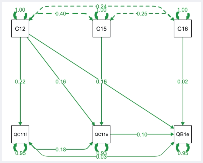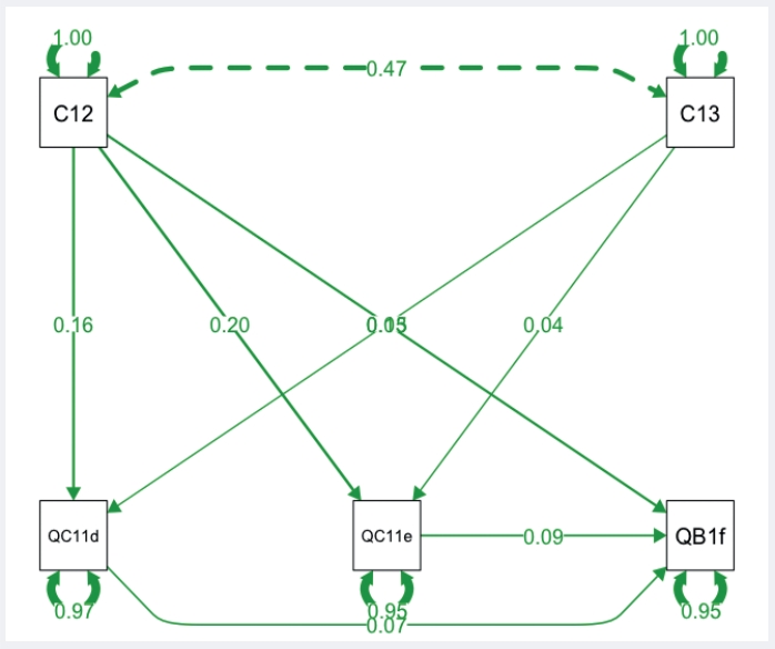 Для применения SEM в сочетании с анализом пути при оценке на первом этапе были использованы результаты логит- и пробит-моделей с высокой ковариацией зависимых переменных. На втором этапе анализ пути был загружен в программное приложение SEM (статистический пакет Lavaan for R) вместе с уравнениями, полученными на предыдущем этапе регрессии. Результаты представлены на приведенных далее диаграммах.