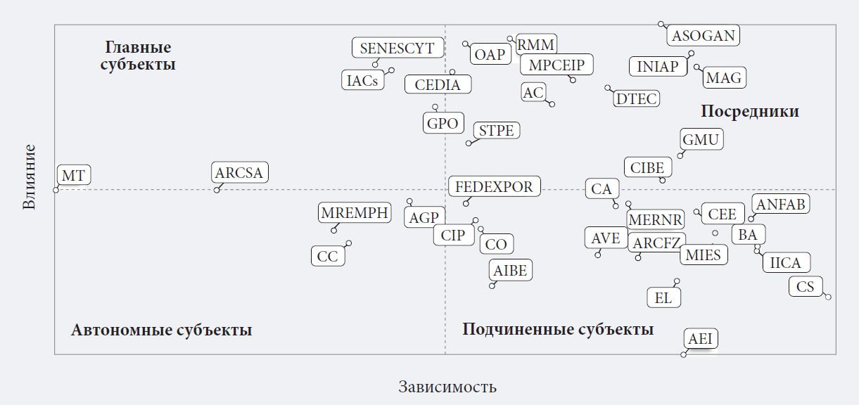 Главные действующие лица | Субъекты, обладающие значительным потенциалом влияния и при этом мало подверженные влиянию других участников системы: в основном внешние институты, представляющие центральные и местные органы власти. |