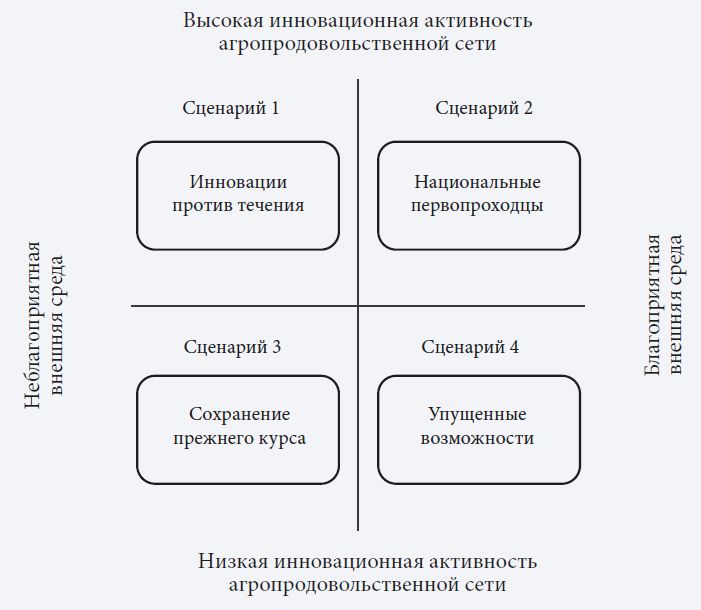 На протяжении всего процесса формирования перспективы оптимизируется системное мышление, которое позволяет решать сложные проблемы со множеством переменных, в частности прогнозировать развитие агропродовольственного сектора. Было предпринято несколько попыток системного анализа этого вопроса. Агропродовольственные сети представляют собой взаимосвязанные конгломераты субъектов, расположенных в едином географическом пространстве и прямо или косвенно вовлеченных в создание потока товаров и услуг для удовлетворения спроса на продукты питания одной или нескольких групп локальных или внешних потребителей (Rastoin et al., 2010). Исследования в рамках перспективного подхода обеспечивают более точную оценку будущих возможностей агропродовольственных систем.